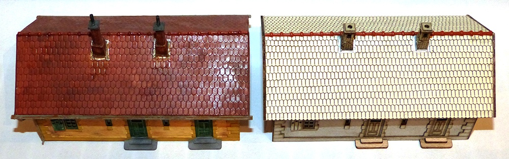 A kúpcserép és az ereszcsatorna gyári Auhagen. A többi saját termés lézervágó segítséggel. A tetőcserép soronként lett felrakva, majd megfestve. A kémény... nos a kéményen van még csiszolni való. Túl sok darabból áll és ez miatt nem tetszik az illesztése. Már körvonalazódik rá a megoldás. |