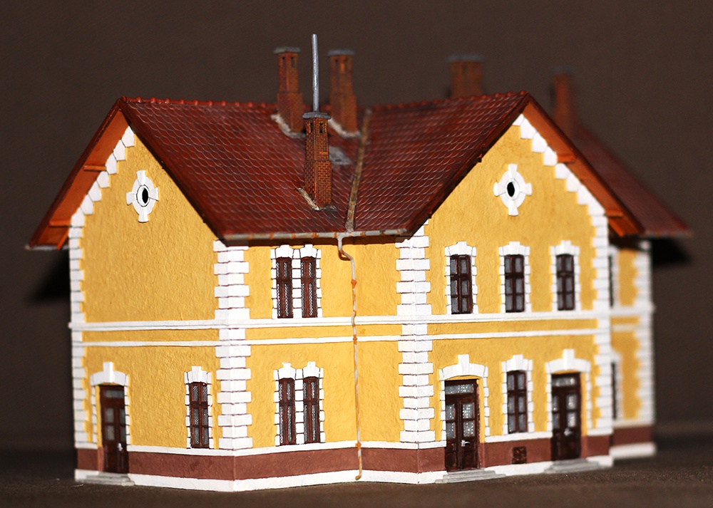 Ma elkészült a váróval egybeépített őrház felújított változata. Apropóját az adta, hogy itt vizsgázott a kémény elgondolásom. Úgy érzem, végre ráleltem a helyes útra, bár a képeken még ez nem látszik. Eddig egy kémény 11(!) darabból állt. Agyrém volt összerakni és egyáltalán nem volt szép. Minden darabot egyesével kellett ferdén elfűrészelni, hogy követhesse a tető ívét. Könnyen nyeklett és ha nem találtam el a szöget, lehetett csiszolni.