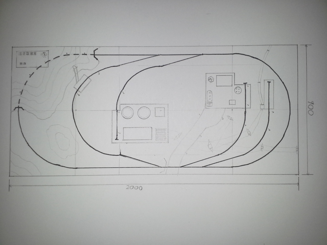 Sziasztok! Egy terepasztalt szeretnék építeni az ágyam alatti fiókba. A makettezéssel nincs gondom, azt már két éve művelem. Viszont vasútmodellezés terén teljesen kezdő vagyok (sínek, mozdonyok, árambetáplálás, stb.). Összesen egy darab mozdony lesz a pályán, és a váltókat szeretném teljesen manuálisan állítani. Afféle ,,játszós'' pálya lenne, teljesen automatika-mentesen. Ez lesz az első terepasztalom. A képen levő fekete vonal a legfontosabb pálya, a ceruzával rajzolt az másodlagos, viszont jó lenne azt is valahogyan megoldani.