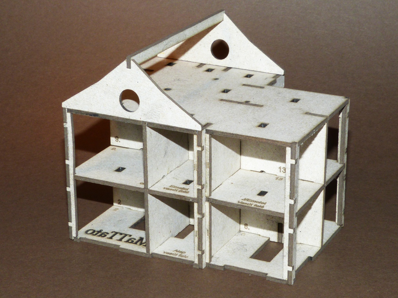 Igen lézerrel. Elkövettem azt a könnyelműséget, hogy a kartont helytelenül tároltam. Így elvetemedett, ezért a vágás itt-ott szőrösre sikerült. De sebaj! Ez úgyis csak egy próba darab amit csak azért raktam össze, hogy lássam passzolnak-e az elemek. Nos akadt még olyan rész, amin igazítani kellett. Ha mindent rendben találok, jöhet a homlokzat!