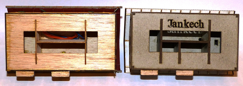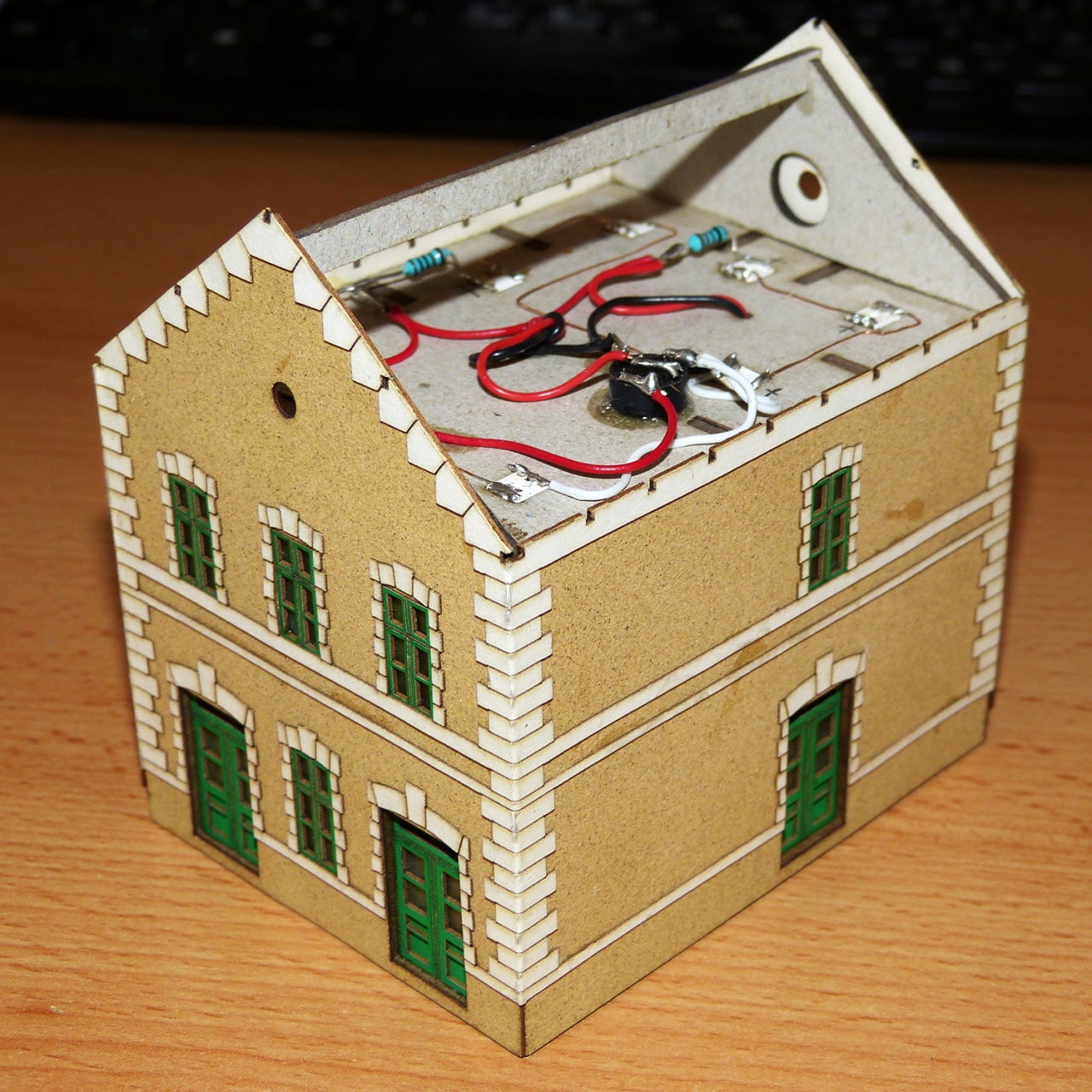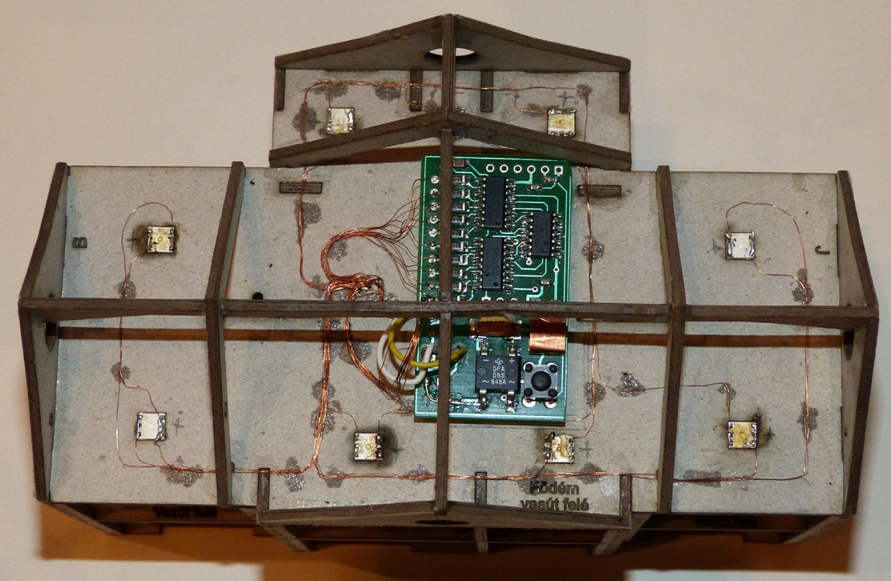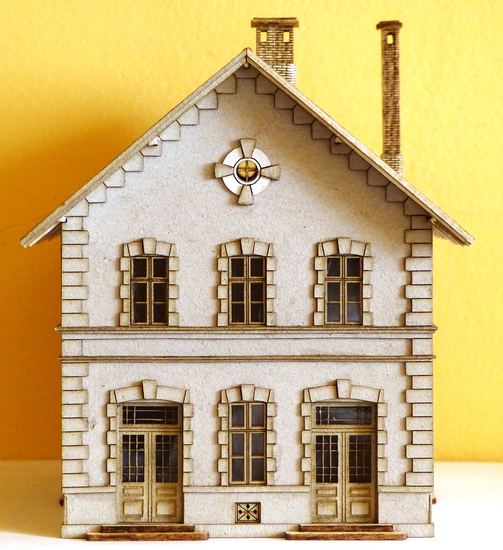 Mindent lézerrel. Az ajtót és az ablakokat mással nem is lehetne. Az ajtóba a bemarás gravírozással készült. Itt próbáltam ki először. Eddig úgy oldottam meg, hogy kivágtam és papírt ragasztottam mögé. Az a megoldás bumfordinak tűnt, gravírozva élethűbb és szebb. |