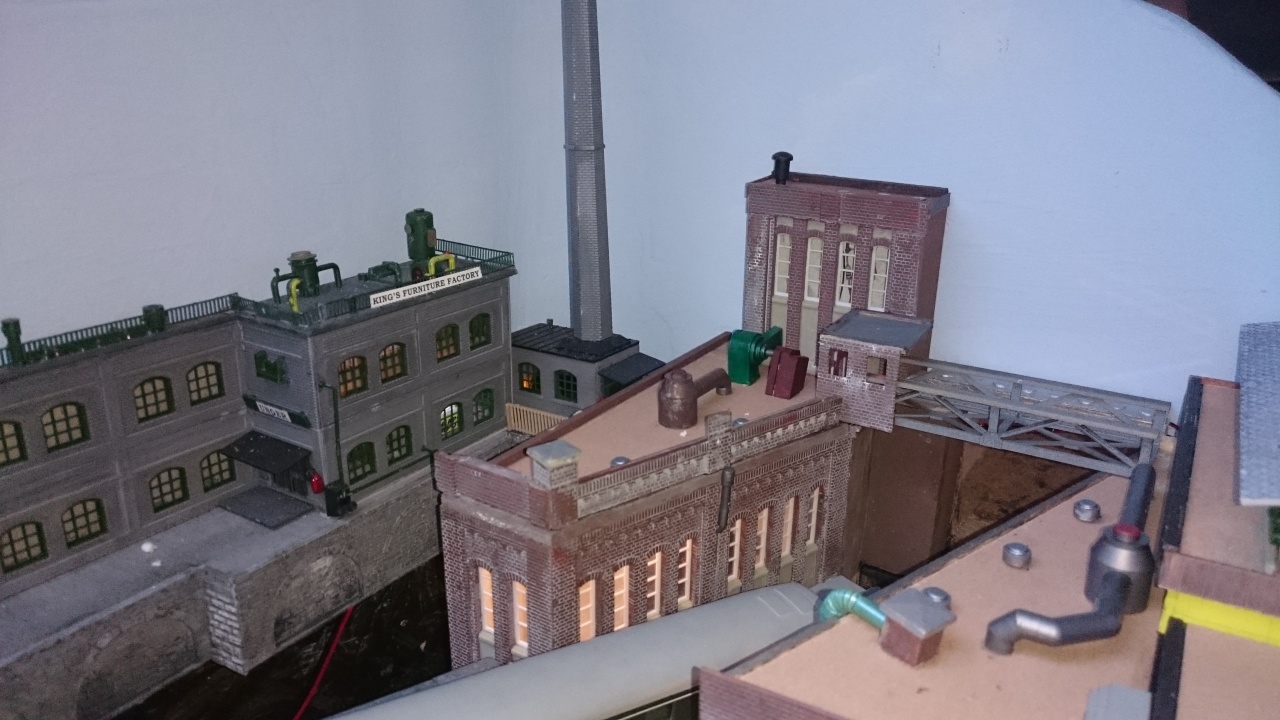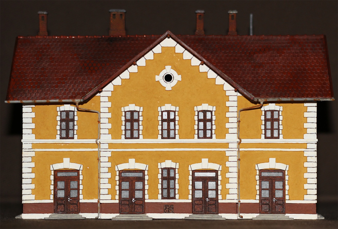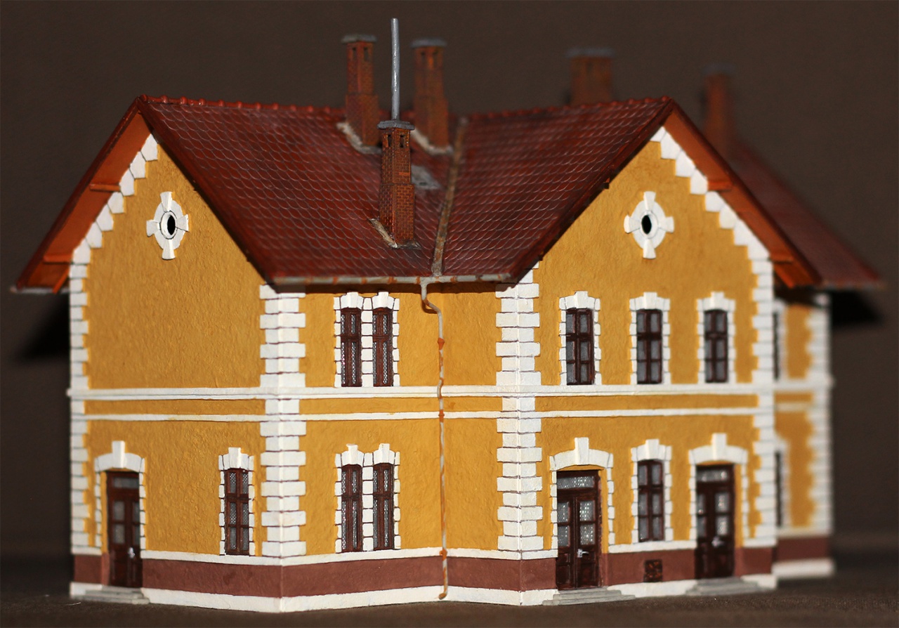 Ma elkészült a váróval egybeépített őrház felújított változata. Apropóját az adta, hogy itt vizsgázott a kémény elgondolásom. Úgy érzem, végre ráleltem a helyes útra, bár a képeken még ez nem látszik. Eddig egy kémény 11(!) darabból állt. Agyrém volt összerakni és egyáltalán nem volt szép. Minden darabot egyesével kellett ferdén elfűrészelni, hogy követhesse a tető ívét. Könnyen nyeklett és ha nem találtam el a szöget, lehetett csiszolni.