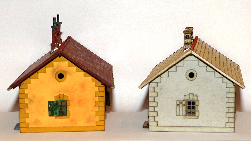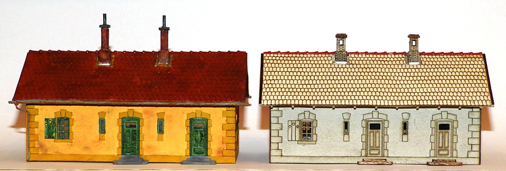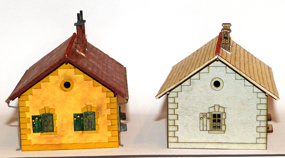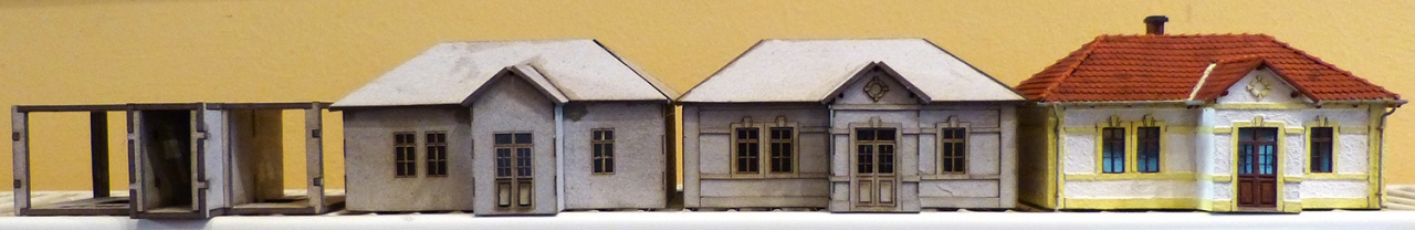 A fotón a fejlődés különböző fázisai láthatók. A festett már majdnem hibátlan. A tetőn van még mit igazítani. A 0,5-ös kartonra ragasztott 0,3-as kartonból vágott cserép együtt sem kellően merev. Ami merevítés a műanyag tető alatt bőven elég, az ide kevés.