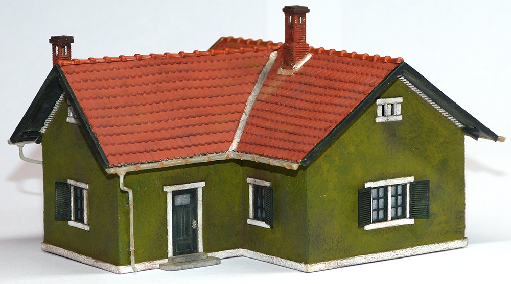 A neten találtam képet a házról és rögtön megtetszett. Amit tudok róla, ez egy rákosligeti két szobás munkáslakás. Típusterv alapján készült épület lehet úgy gondolom. Az sem kizárt, hogy máshol is építettek belőle. Nem sok köze van a vasúthoz, de terepasztalon elhelyezve érdekes színfolt lehet.