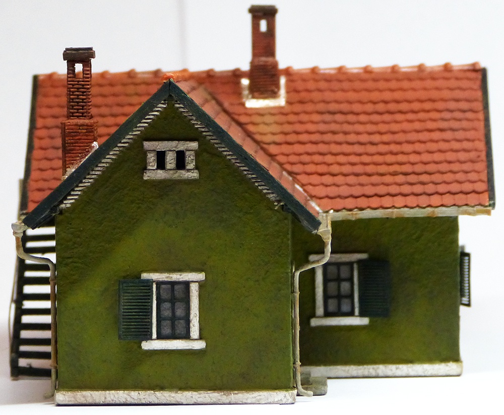 Gyári színezésnél beragasztom az ajtókat és ablakokat, majd üvegezek és függönyözök. Ezután felragasztom a homlokzatokat. Száradás után rakom fel a díszítést egy darabban, így csak egy élnél látszik illesztés. Jöhet a lépcső a tető és a gerenda. Végül a kémény némi bádogozással és egy kis patina.
