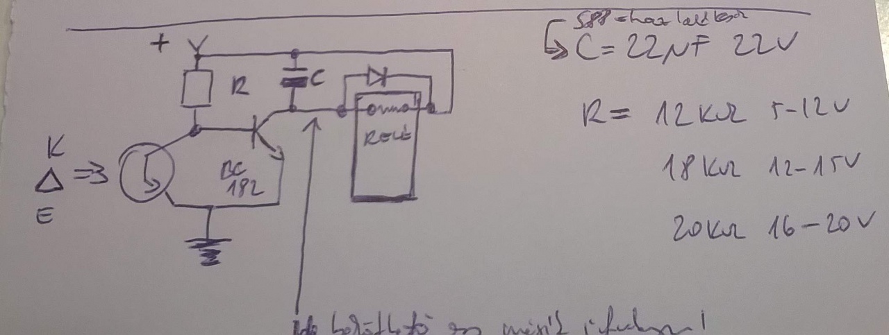 Valami "jelhosszabbító" kellene. Gondoltam itt egy rc-körre (kondenzátorra), de nincs ötletem, hogyan kössem be a kondit a bc182 kollektorára. Az is jó megoldás, ha a relét tudom hosszabban "meghúzatni", mert ide egy egyszerű egyáramkörös relé is jó (200Ft). A lényeg, hogy a rövid triggert, valahogy megnöveljem.
