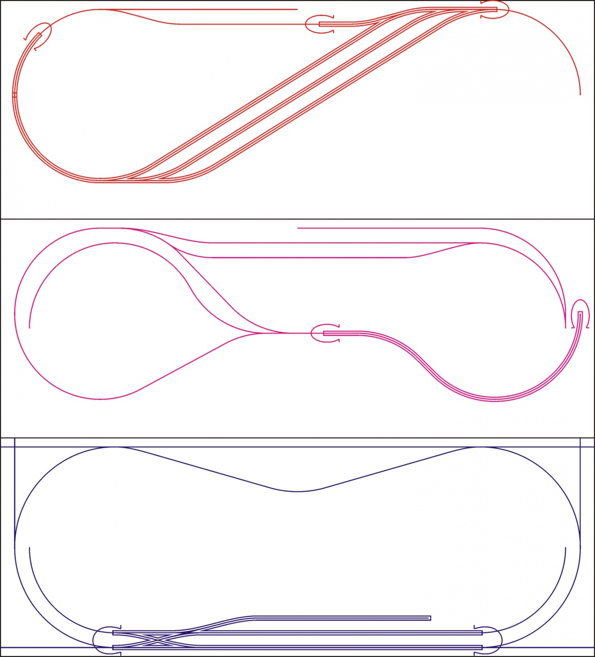 Akkor a teljes vágányrajz. Az alsó szinten a külső körre el lehet dugni két vonatot, a középsőn pedig egyet. A középső szinten van az egyik hurok, ahol az állomás alatt vissza lehet fordulni, a másik pedig az állomás szintjén a hátsó oldalon. Elég kicsi a hely, de úgy gondolom, elég jól játszható vágányutakat sikerült összeraknom. Itt is vannak rejtett részek rendesen, de közel sem annyi, mint az előző verzióban.