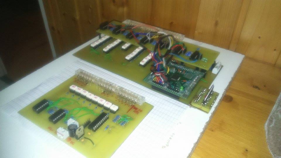 RS flip flopot raktam össze eddig amit a vezérlő PIC kimenő jelei állítottak ("emelet") de ez így csak közvetett visszajelzés, nem a végállást mutatja, plusz össze vissza zavarták a dobozban lévő egyéb más relés kapcsolások az FZ1 trafóról nem is beszélve. Alul optotriakok kapcsolják a váltókat, a vezérlő pedig a vágányútállítás sorrendjét adja a nyomógombok lenyomása függvényében. |