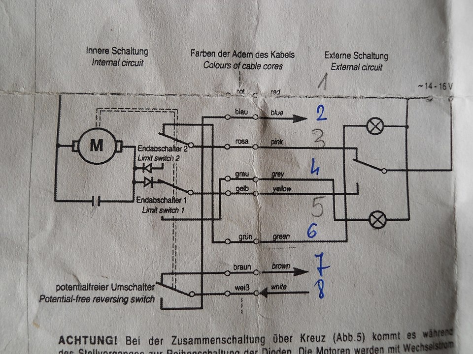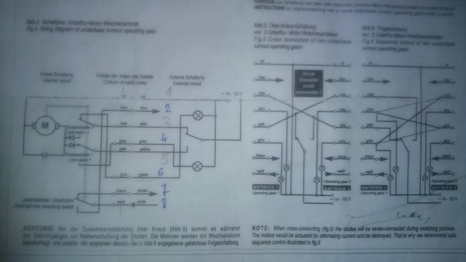 Ugyanis valódi váltó véghelyzetet visszajelezni ezzel a hajtóművel és a régi "zongorabillenytűkkel"/nyomógombokkal nem igazán lehet. Ugyanis a Tillig a leírásban "tastenpult-ot" ír, vagyis a billentyűs, jó öreg, de agyonverhetetlen kapcsolópultra gondol, de a rajzon a jelek egy átkapcsolóra (umschalter) utalnak. Vagyis nem megnyomunk egy gombot/billentyűt, hanem a kitérő állításakor egy kapcsolót átkapcsolunk. Van egy "árnyalatnyi" különbség, nem?  A motor végállás lekapcsolását meg rábízzák az állítóműben belül található csúszókapcsolókra.