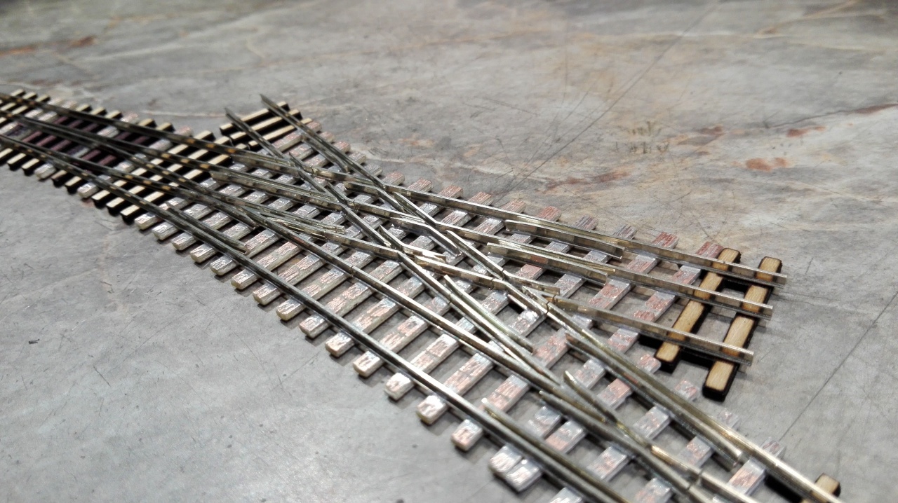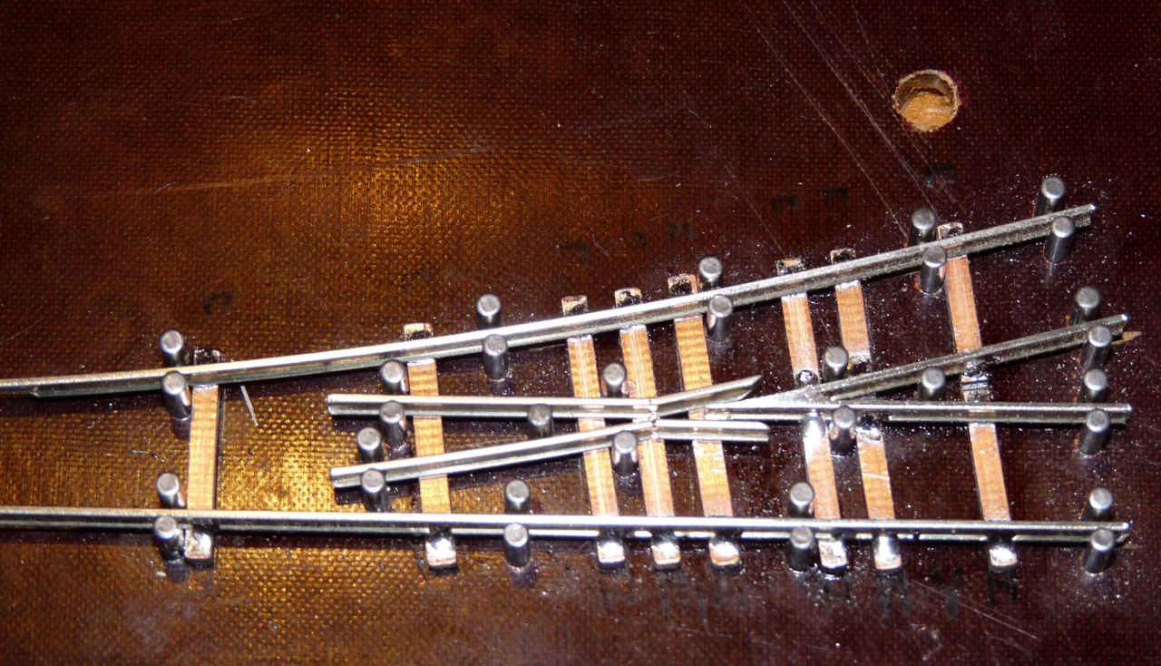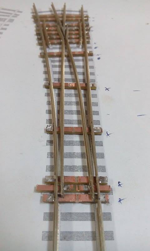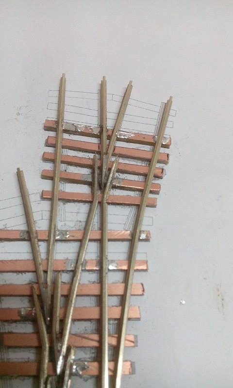A vezetősínek még készítés alatt álltak amikor a képek készültek  a szigetelő vágások is elkészültek már , és megcsináltam a síntalpak kikönnyítését is ( így tényleg sokkal könnyebben állítható a váltó ).