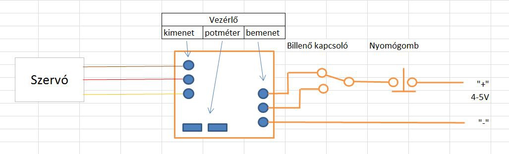 A szervók végállását egy házilag készített vezérlő segítégével állítom be. A kapcsolást egy nyomógomb és egy kapcsoló biztosítja. 1-2 oldallal ezelőtt részletesen is megtalálod.