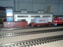 A hátsó ívből lesz a főpályáról a kicsatlakozás. A teherpályaudvar (lenti rész) 5 vágányos. Bal oldalt lesz majd egy mozdonyszín (ide van valamilyen javaslatotok MÁV stílusban) esetleg üzemanyagtöltővel kiegészítve. A raktárépület két oldalán egy-egy rakodóvágány, a kettő között egy rövid tárolóvágány. A jobb szélső rakodó mellé egy konténer fogadó területet gondoltam. Fent a balra kiágazó a kihúzóvágány.
