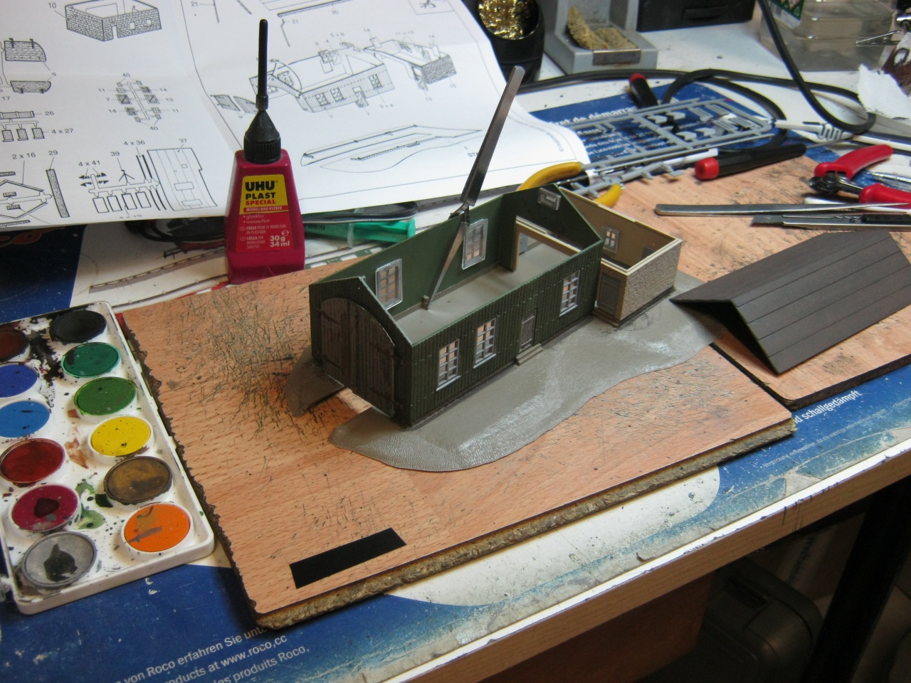 Nos, most szabadul fel a műhelynek annyi ideje, hogy a nagyobb feladatokhoz hozzá tudjak fogni, készen van az asztalos üzem is, méretre vágták a rétegelt lemezeket: a 6mm-est az alaplaphoz, a 10mm-est pedig a merevítés keretének. Addig a lopott percekben, félórákban egy picit előre dolgoztam két épületen. A kis állomás fűtőházán és szenelőjén, mindkettő Auhagen gyártmány, köszönet a VMC-nek értük! |