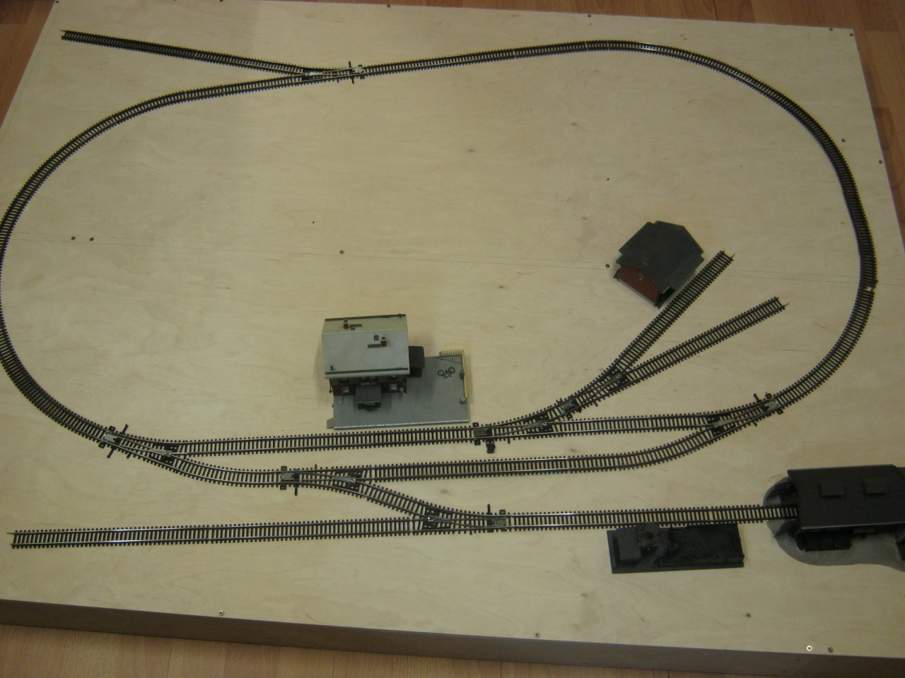 A hátsó ívből lesz a főpályáról a kicsatlakozás. A teherpályaudvar (lenti rész) 5 vágányos. Bal oldalt lesz majd egy mozdonyszín (ide van valamilyen javaslatotok MÁV stílusban) esetleg üzemanyagtöltővel kiegészítve. A raktárépület két oldalán egy-egy rakodóvágány, a kettő között egy rövid tárolóvágány. A jobb szélső rakodó mellé egy konténer fogadó területet gondoltam. Fent a balra kiágazó a kihúzóvágány.
