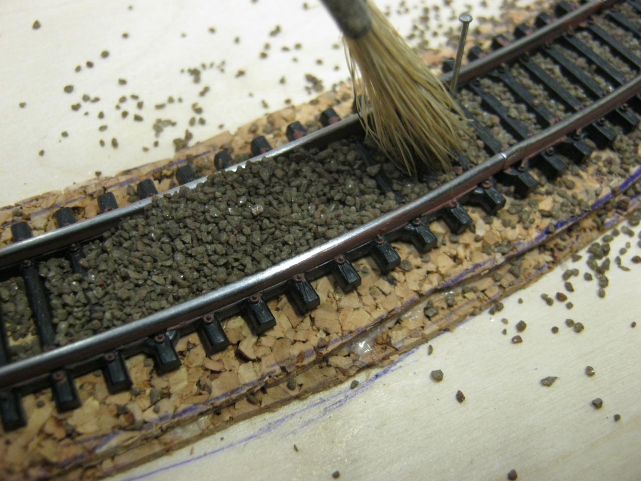 Jól látod, ha megkötött a ragasztó, akkor csak maga az ágyazat rögzíti a síneket. Elegendő, nem tud mozogni, ha kivártuk az egy nap kötési időt. A parafa, az természetesen fixen le van ragasztva, higítás nélküli faragasztóval.