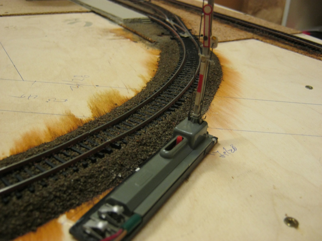 A síneket előre lefestettem rozsda színű festékkel. Ez vízbázisú, így eléggé könnyen kezelhető, még olyannak is, akik életében először csinál ilyesmit. Simán ecseteltem. A színe ugyan vörösebb a szerintem megfelelőnél, de ez kölcsön festék egy kolléga jóvoltából, aki tegnap este áthozta nekem. Ugyanis a megfelelőbb színű, Humbrol 113-as kódú festékkel megjártam. Én nyitottam ki, vadonat új volt. Csakhogy az ezzel patinált sínnel nyugodtan meheTTem volna egy UTE meccsre a B-középbe ordítani... Szép, lila festék van beletöltve a rozsda szín helyett...