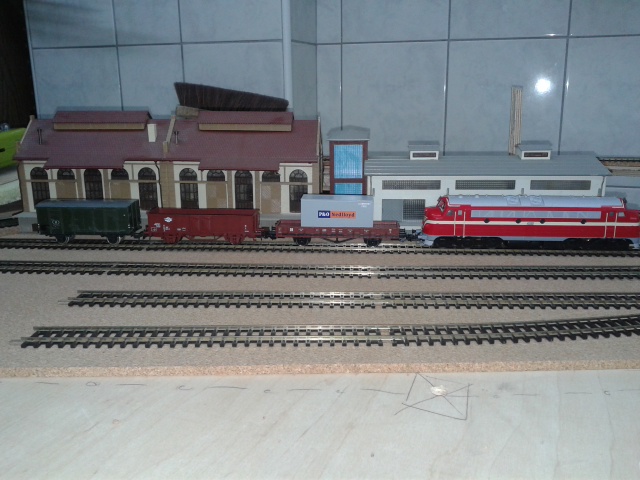 A hátsó ívből lesz a főpályáról a kicsatlakozás. A teherpályaudvar (lenti rész) 5 vágányos. Bal oldalt lesz majd egy mozdonyszín (ide van valamilyen javaslatotok MÁV stílusban) esetleg üzemanyagtöltővel kiegészítve. A raktárépület két oldalán egy-egy rakodóvágány, a kettő között egy rövid tárolóvágány. A jobb szélső rakodó mellé egy konténer fogadó területet gondoltam. Fent a balra kiágazó a kihúzóvágány.