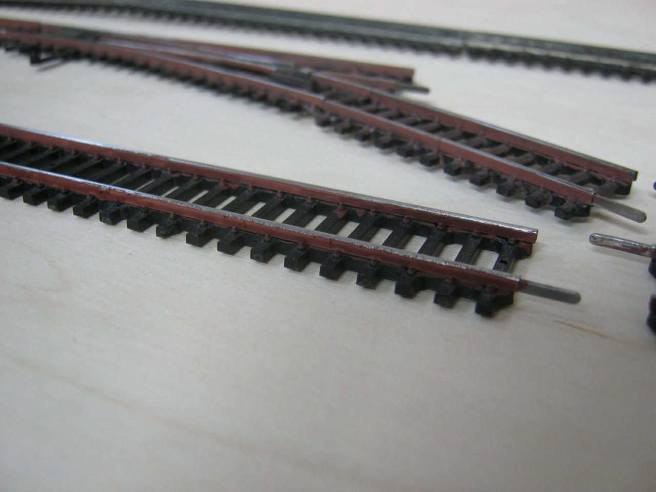 A síneket előre lefestettem rozsda színű festékkel. Ez vízbázisú, így eléggé könnyen kezelhető, még olyannak is, akik életében először csinál ilyesmit. Simán ecseteltem. A színe ugyan vörösebb a szerintem megfelelőnél, de ez kölcsön festék egy kolléga jóvoltából, aki tegnap este áthozta nekem. Ugyanis a megfelelőbb színű, Humbrol 113-as kódú festékkel megjártam. Én nyitottam ki, vadonat új volt. Csakhogy az ezzel patinált sínnel nyugodtan meheTTem volna egy UTE meccsre a B-középbe ordítani... Szép, lila festék van beletöltve a rozsda szín helyett...
