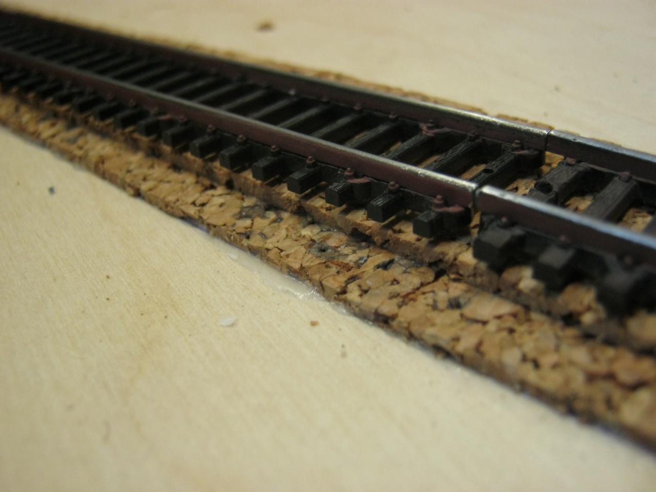 Jól látod, ha megkötött a ragasztó, akkor csak maga az ágyazat rögzíti a síneket. Elegendő, nem tud mozogni, ha kivártuk az egy nap kötési időt. A parafa, az természetesen fixen le van ragasztva, higítás nélküli faragasztóval.
