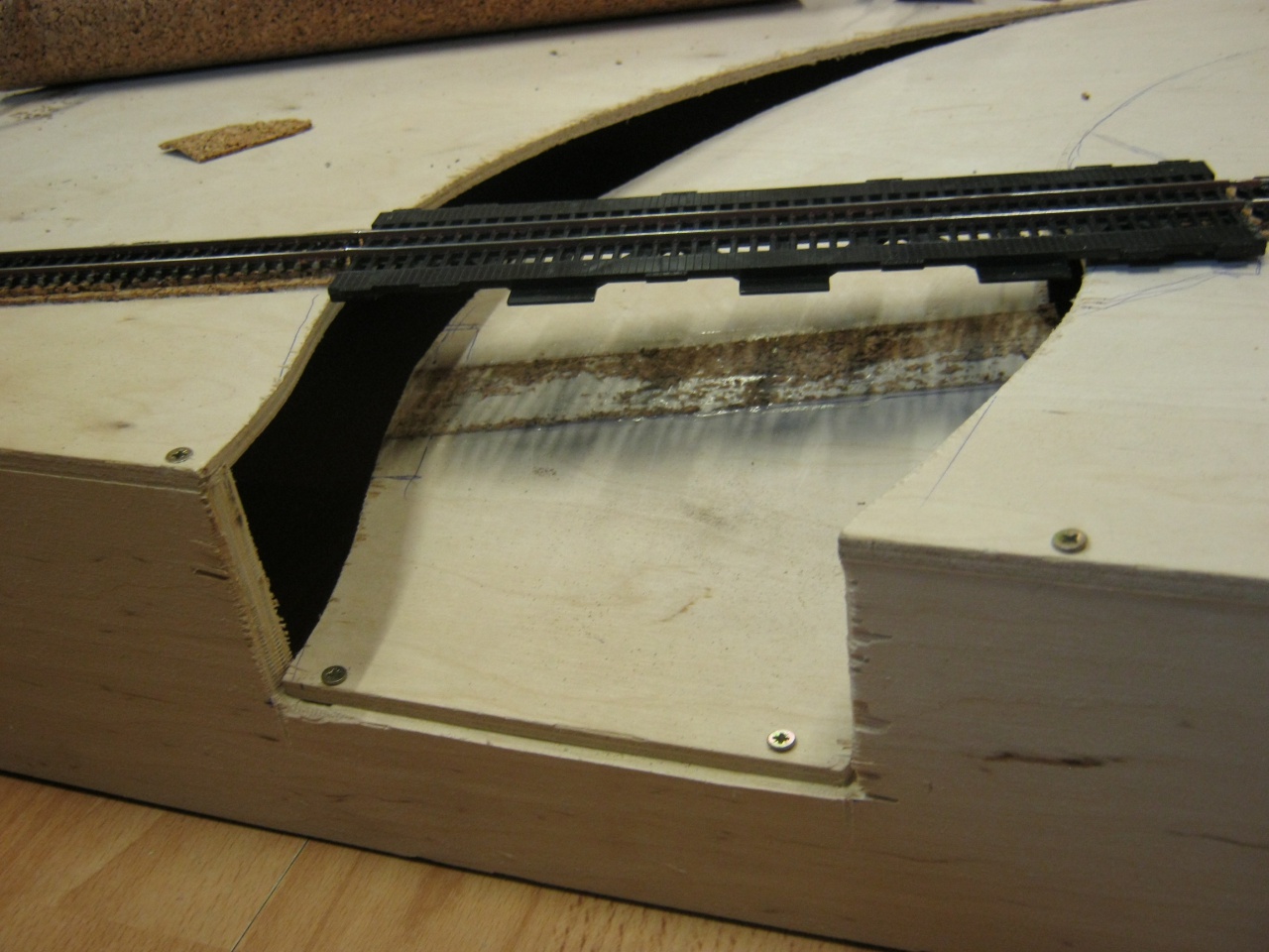 Képek majd holnap, ha minden jól megy. Természetesen majdnem kihagytam egy lépést, a neveztesen a közúti "sűlyesztését" a híd alá. Ez úgy készült, hogy berajzoltam a híd helyét, majd megfúrtam a közúti lejtő kezdőpontján a két oldalon az alaplemezt, és dekopír fűrésszel kivágtam, de úgy, hogy a két furat között nem vágtam! Így a lemez kvázi "magától" hajlik meg. Ezután a keret hátoldalán is kivágtam a keretet a szükséges mértékben, és a lehajlott lemezt oda is csavaroztam.