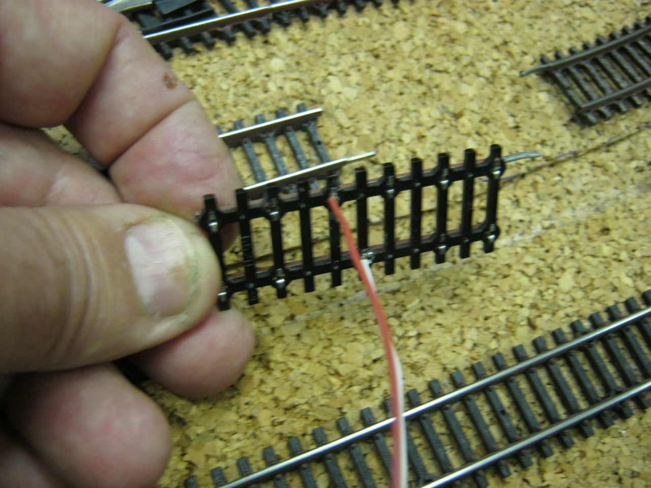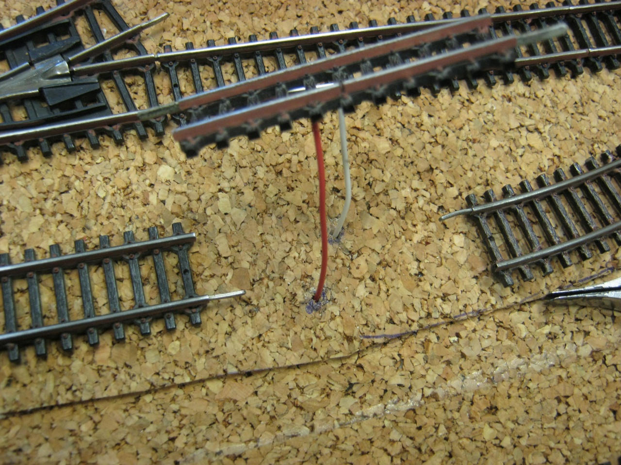 Mielőtt a sínek rögzítésre kerülnének, és az ágyazat is elkészül, előbb az elektromos bekötéseket is meg kell csinálni. Ahogy a korábbi Z méretű asztalnál, úgy iTT sem használok semmilyen bekötő, vagy szakaszoló sínt. Nemes egyszerűséggel a vékony vezetékeket alulról ráforrasztom a sínre. Figyelem! Erre csak olyanok vállalkozzanak, akiknek van már némi gyakorlatuk a forrasztásban, és van is egy vékony, max. 50W-os, szabályozható pákájuk! "Bádogos páka" esetén ezt inkább hagyjuk, és használjunk bekötő síneket!