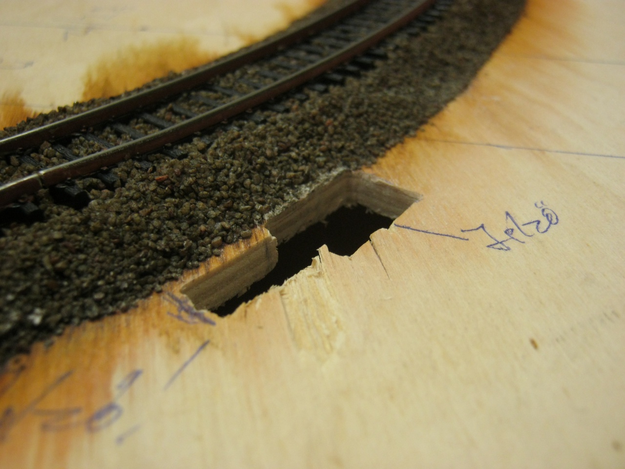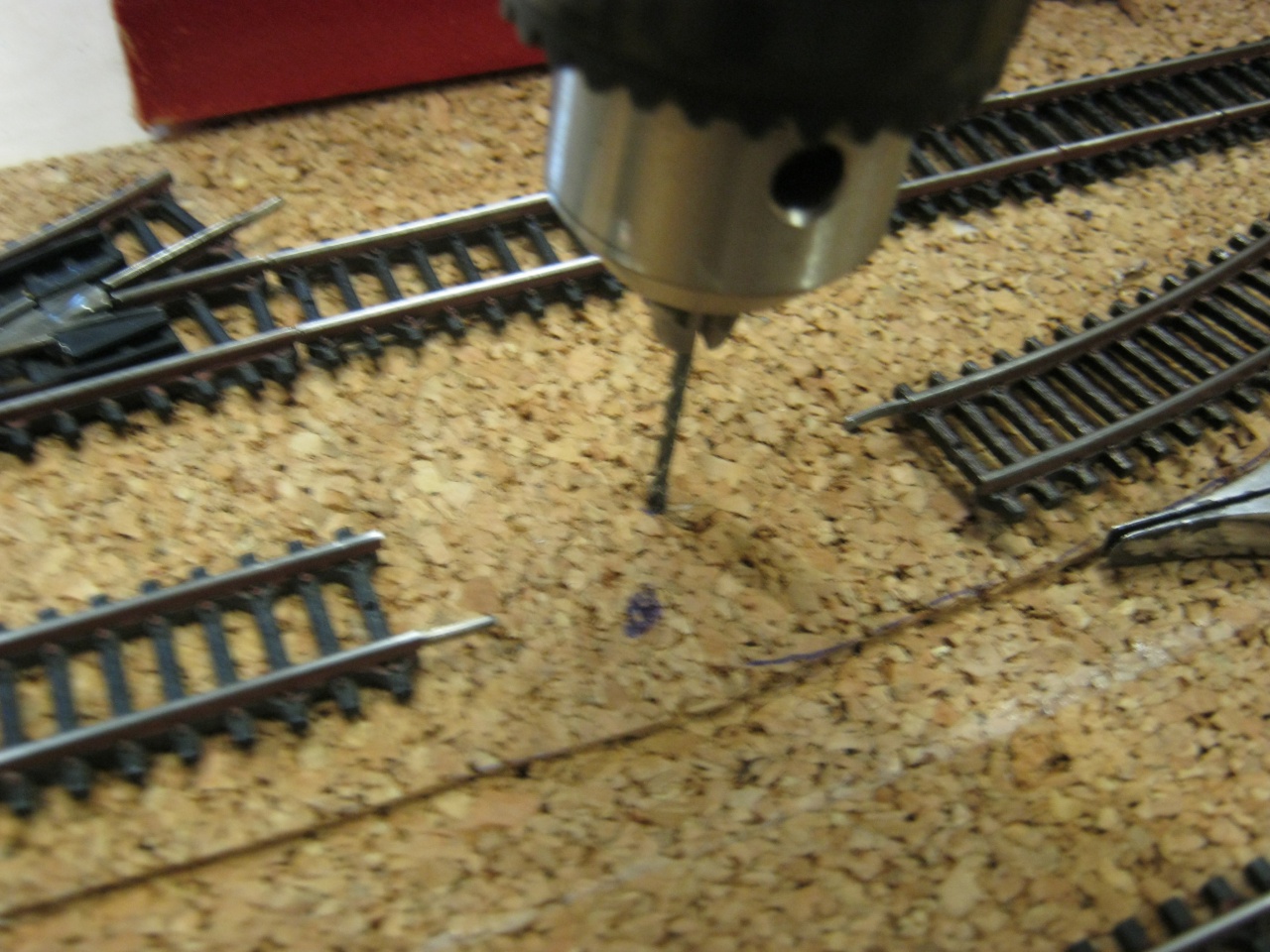 Ugyanis a BTTB váltókhoz adott állítóüművet el lehet rejteni az asztallap alá, így nem fog majd éktelenkedni a sínek mellett. Ez a cucc a mai napig kapható, a Tillig cikkszáma: 07960. 7mm-es lyukat kell fúrnik ehhez az alaplemezbe. Ezt fúrjuk ki minden váltónál, mielőtt az ágyazattal óvatosan rögzítjük őket.