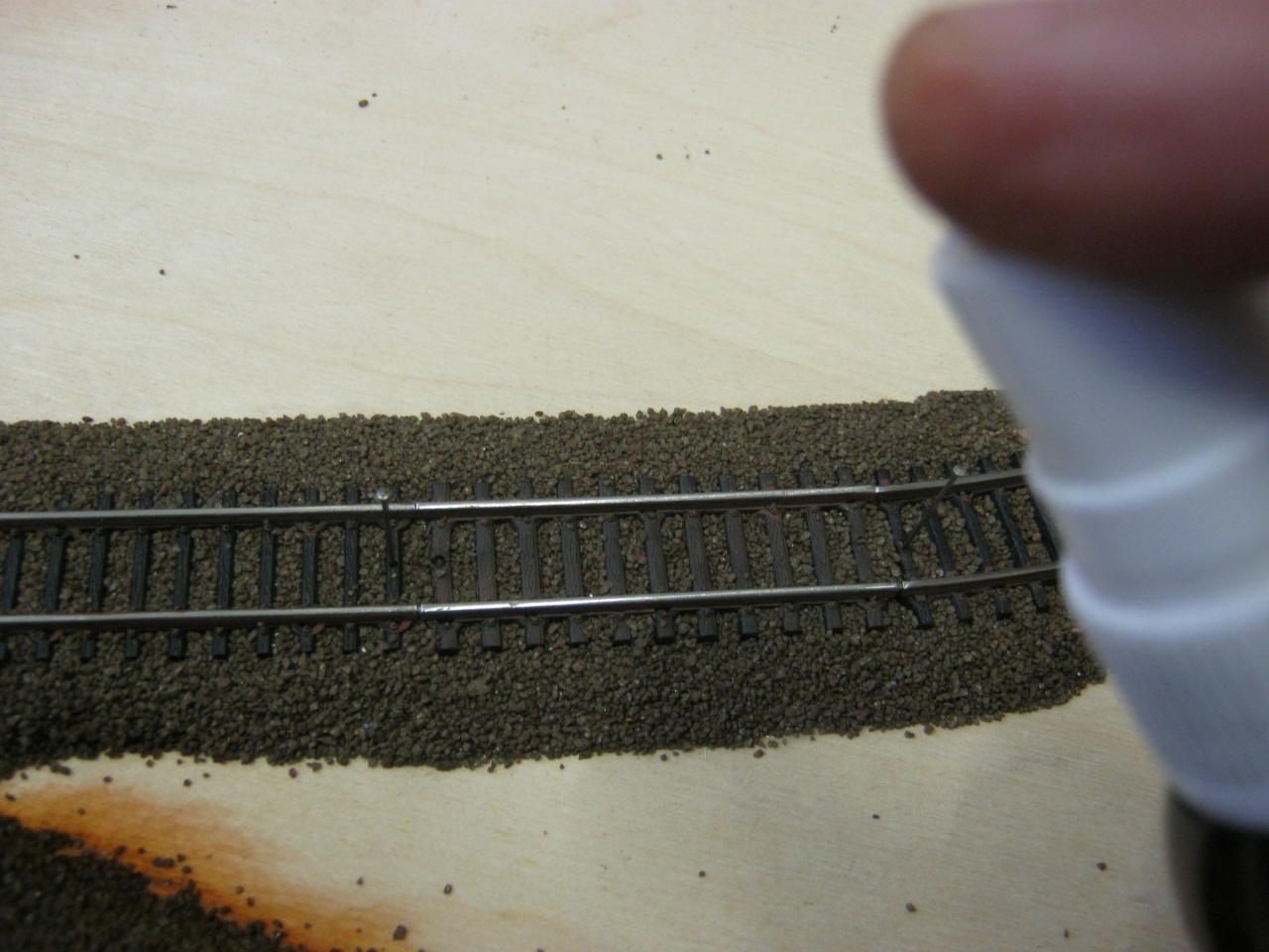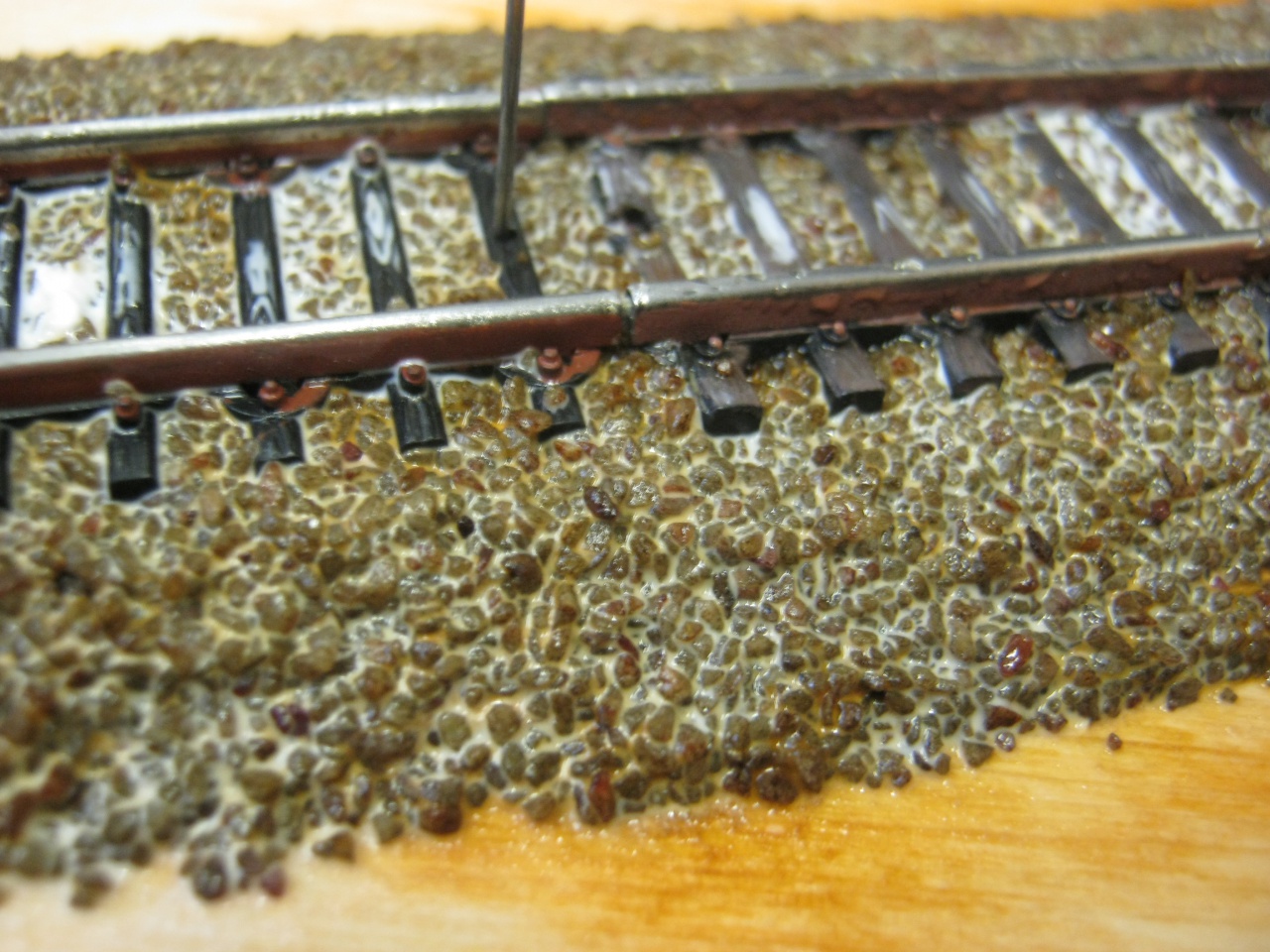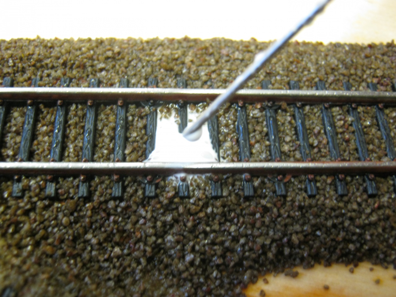 A ragasztó becsepegtetését az elecsetelt ágyazatra nem kell túlzásba vinni! TT méretben egy csepp/talpfaköz elegendő, és kb ugyanilyen arányban az oldalakon is. H0-ban ez egy picit több, lehet két kövér csepp is. De nem kell, sőt felesleges is "telepumpálni" ragasztóval az ágyazatot.