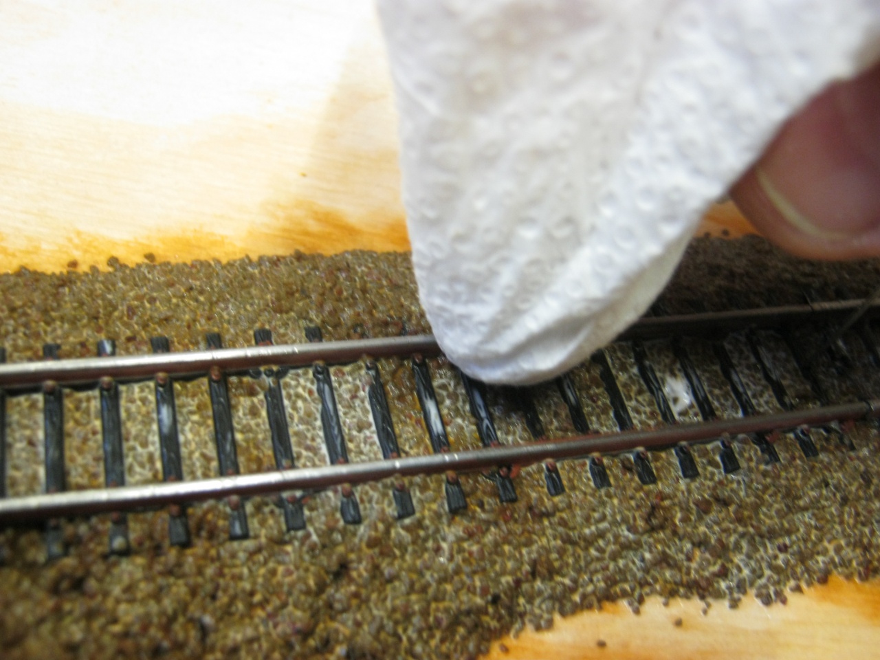 Ha végeztünk egy szakasszal, a felesleges vizet a sínszálak felületéről le kell törölni. Én ezt konyhai papírtörlővel szoktam csinálni. Vigyázat, az ujjunkra alaposan feszítsük rá a törlőpapírt, ne lógjon rá a ragasztós ágyazatra, mert az még képlékeny!