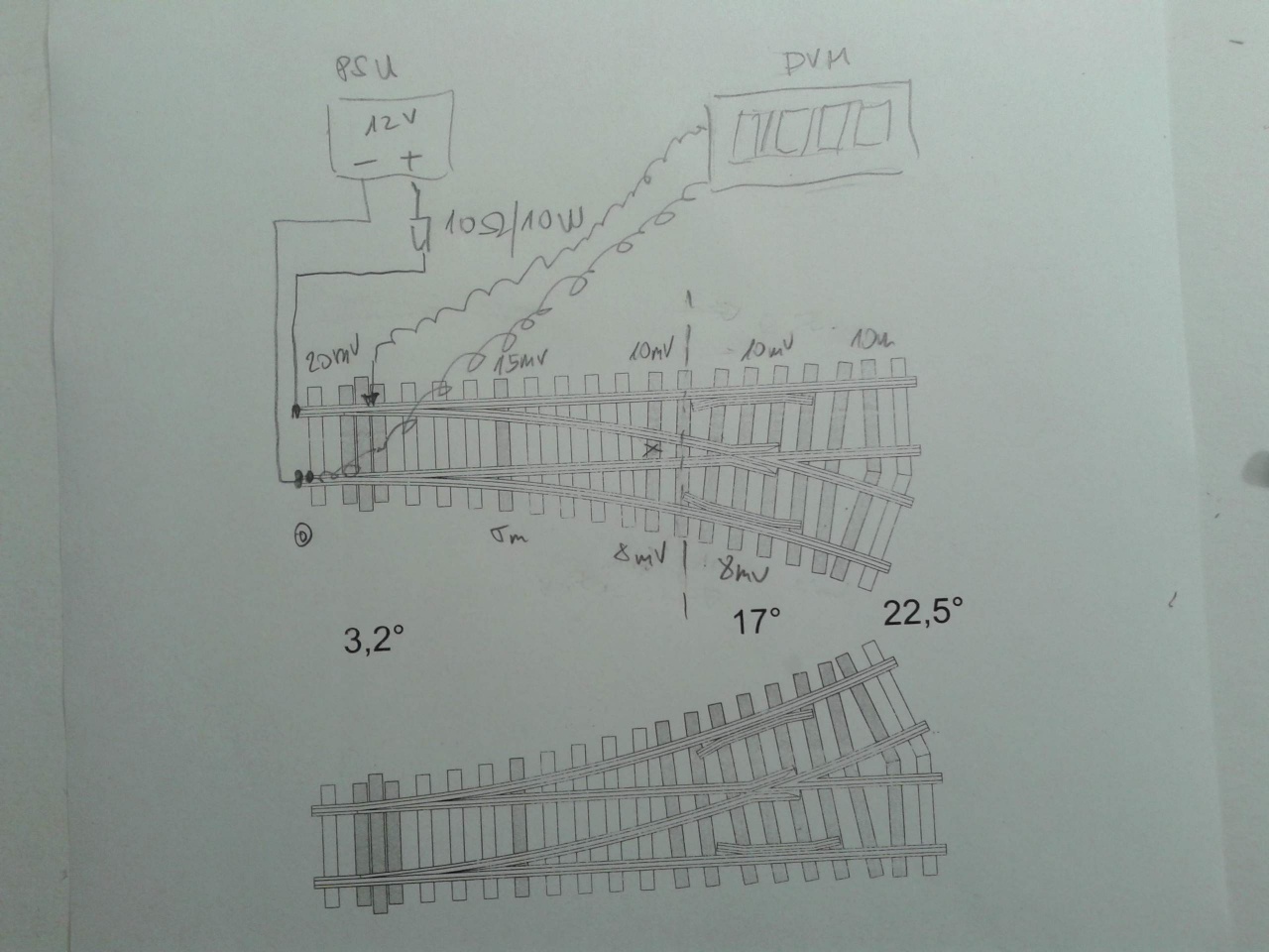 Műszer az hasznos, már csak azért is mert azzal tudod megállapítani merre folyik nagyobb áram. A pédaképen pl kiválasztasz a betáp ponthoz képest két irányba kért azonos hosszúságú sínszakaszt (csak az egyik oldalát ) leméred a betápláláshoz képest a két irányba hány mV esik. Amelyik oldal több abban az irányban van a nagyobb fogyasztó.A két érték segítségével a zárlat szinte pontos helyét meg lehet találni. Egy lassan menő mozdony is megállapítható hol van 20-25 cm-es síndarabokon mért feszültségekből.Vagy egyszerűen a betáphoz képest amíg nő a feszültség a távolság növelésével addíg a terhelés előtt vagy, ha nem változik akkor már utána. |