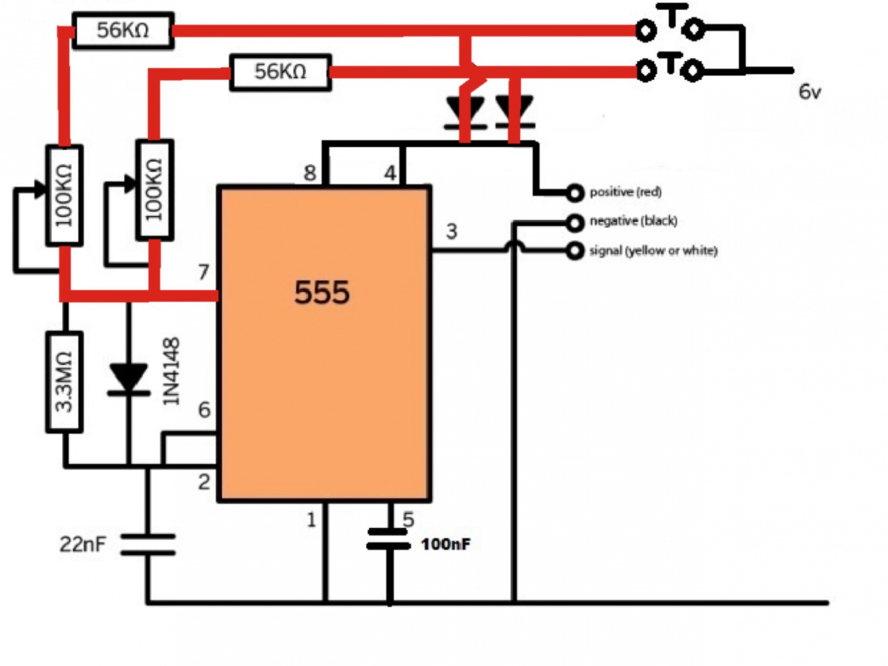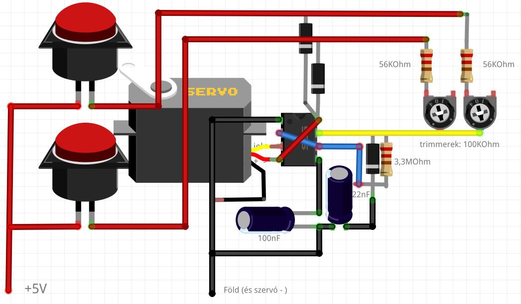 Mi a különbség, ha az egyik kapcsolót nyomom, és mi, ha a másikat? Mindkettő a pozitívról indul, mindkettő egy-egy diódával át van kötve a 4-8 lábra és a szervó pozitív kimenetére, utána mindkettőn van sorban egy 56K ellenállás, és egy 100K poti, és mindkettő be van kötve a 7. lábhoz. |