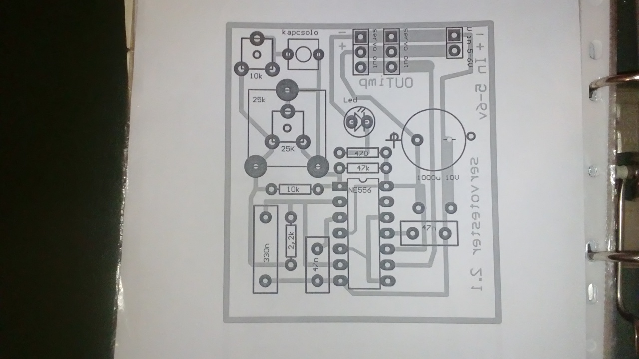 Viszont az áramkör működését tudod barkács módon tesztelni: a jel kimenetére köss egy led hosszabbik (pozitív) felét, a másikat meg kösd hozzá a földhöz (igazából egy ellenállás sem ártana de rövid időre nem lesz baj a lednek) ha gombnyomásra felvillan akkor ad ki magából valamit, ha nem akkor lehet hogy az IC döglött meg (pl ha fordítva kötötted rá egyszer is a szervót) |