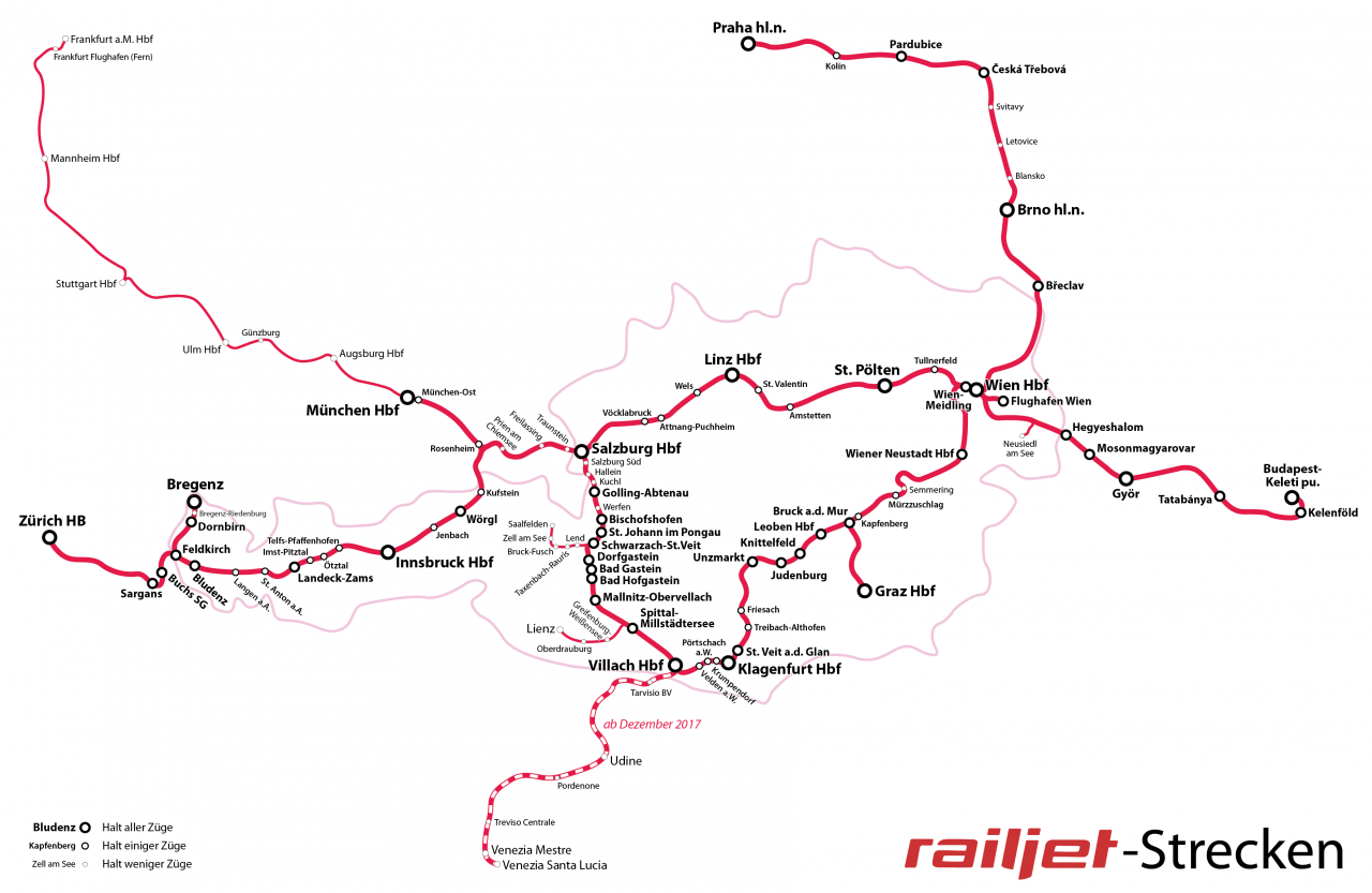 Kb ez van, láthato, hogy majd egyszer elindul talán Velencéig. (Már 2008-ban tervben volt). A többi olasz célpont már tul messze van egy ilyen vonatnak mert Ausztriában dél felé nincs egyetlen nagysebességü pálya sem, igy a RJ-nek is több szakaszon 80 km/h-val kell döcögnie, ami aligha érdekes a távolsági utas számára. Azaz Milano nem igen lesz célpont. |