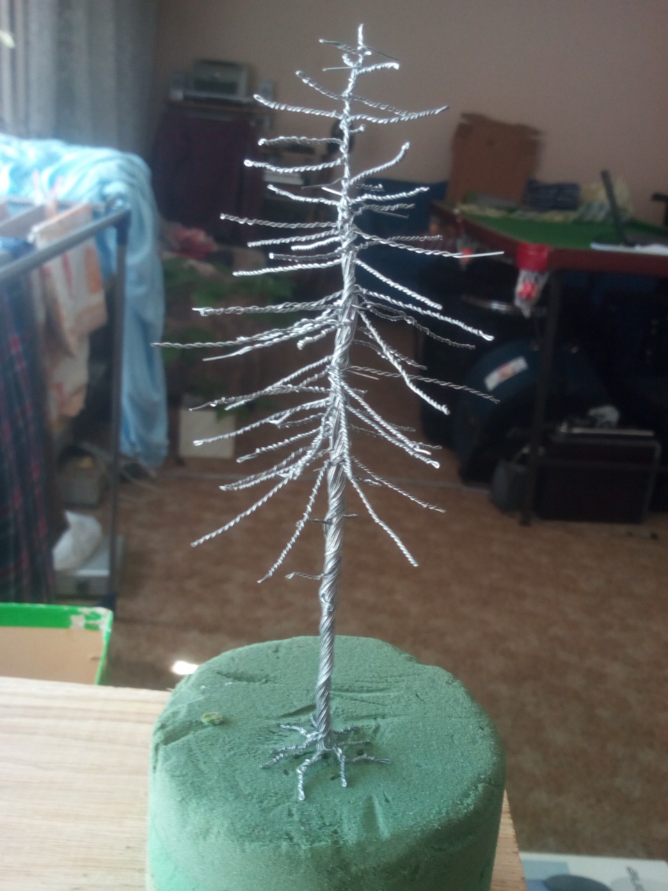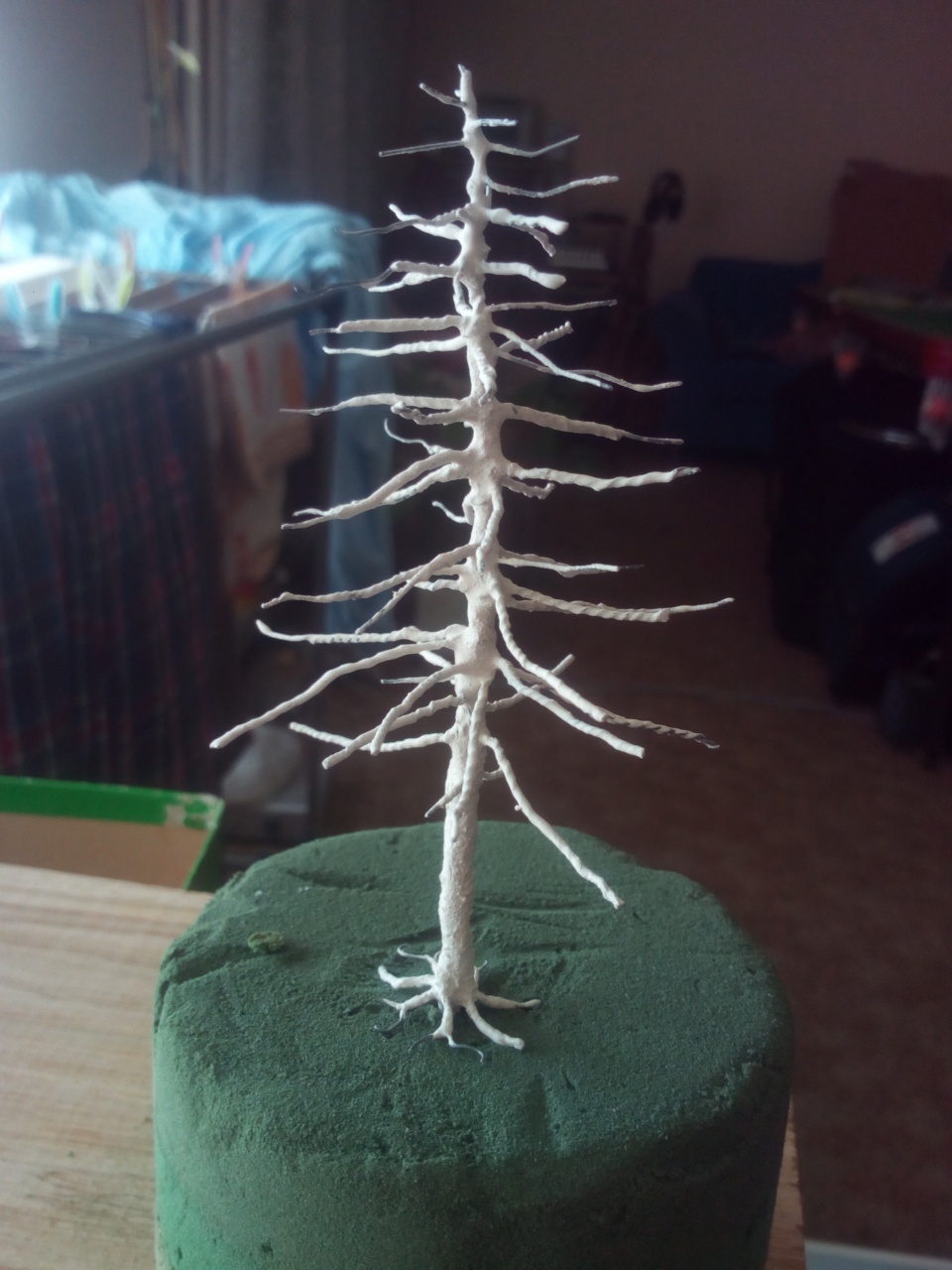 Amíg várom a korábbiak lombozódását, tekertem pár fenyő alapot. Ötletem már van, hogyan lehetne a lombját megvalósítani, de még egyelőre elméleti síkon vagyok vele, mert még nem érkezett meg minden hozzávalóm. |