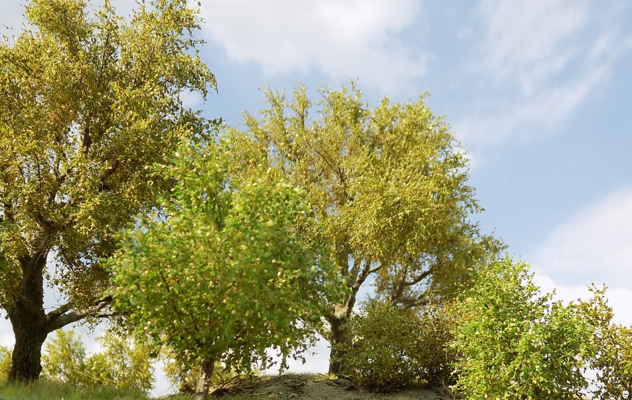 Van még egy egyenesebb szárú testvére, arra tervezek lombot, bár a korábbi szűrőanyag szálait kevésbé lehet kócolni, és gyakran síkban maradnak a szálak. Erre vonatkozóan nem találtam meg még az ideális anyagot, ami mind a levél-szóróanyagok, mind az aprított festett szivacsdarabkákhoz jó lenne. Láttam ugyan olyan videókat, ahol Noch anyagokat használnak ehhez, de ahogy a fórumot néztem, van annál elegánsabb megoldás is. |