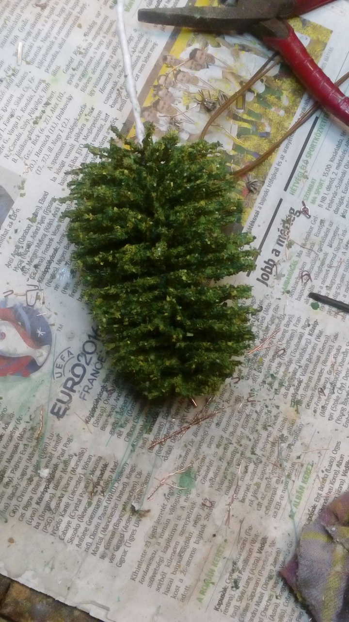 Amíg várom a korábbiak lombozódását, tekertem pár fenyő alapot. Ötletem már van, hogyan lehetne a lombját megvalósítani, de még egyelőre elméleti síkon vagyok vele, mert még nem érkezett meg minden hozzávalóm. |