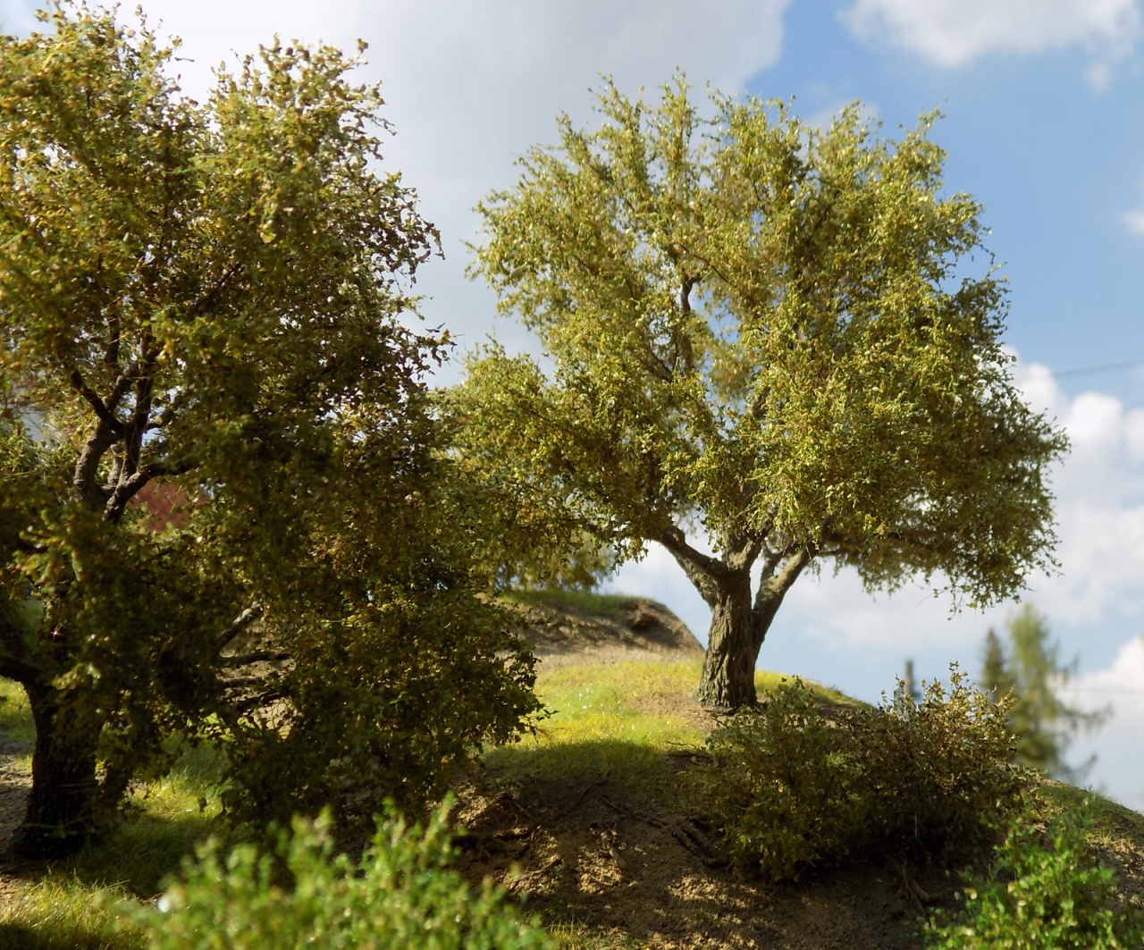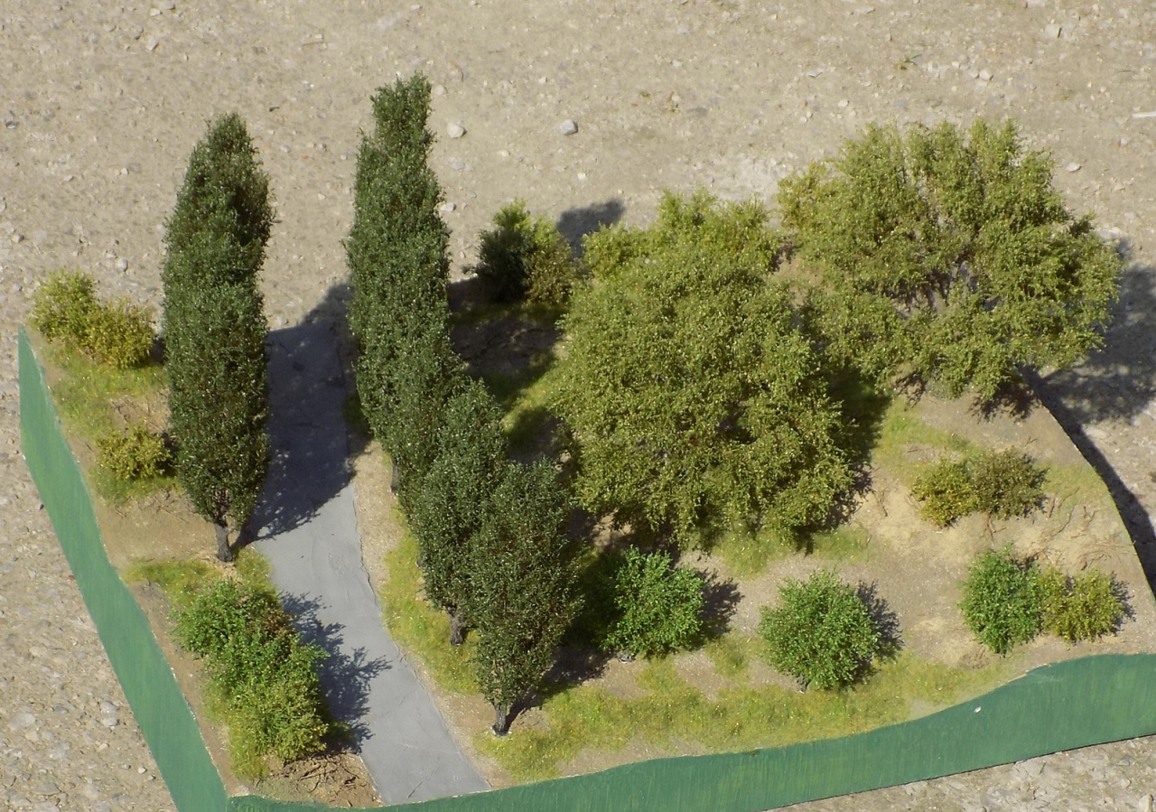 Van még egy egyenesebb szárú testvére, arra tervezek lombot, bár a korábbi szűrőanyag szálait kevésbé lehet kócolni, és gyakran síkban maradnak a szálak. Erre vonatkozóan nem találtam meg még az ideális anyagot, ami mind a levél-szóróanyagok, mind az aprított festett szivacsdarabkákhoz jó lenne. Láttam ugyan olyan videókat, ahol Noch anyagokat használnak ehhez, de ahogy a fórumot néztem, van annál elegánsabb megoldás is. |