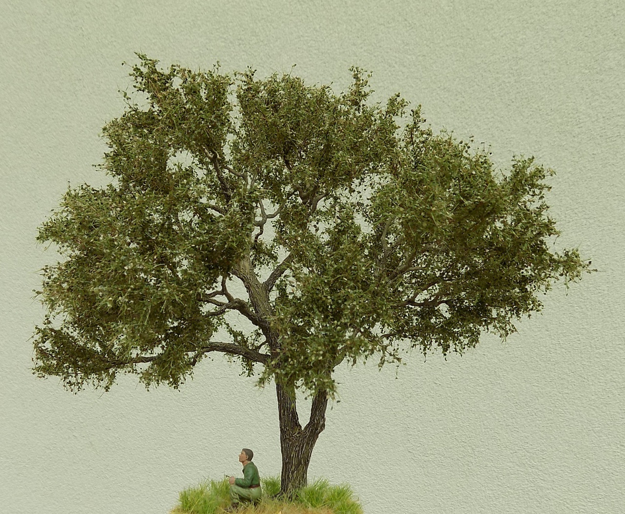 A lomb: Noch 2,5 mm szórható fű. Az ötlet itt kezdődött aztán rájöttem mire hozzám kerül a duplájába fog kerülni. (futár költség) Aztán jött az ötlet a videókból: fűrészpor. Fűrészpor+ sötétzöld akrilfesték+ víz víz/ festék 1:1 arányban. Szárítás: sütőben kis lángon 3 percenként ellenőrizni. utána teaszűrőn szitálni, durva szemcsét kávé darálóban őrölni, újra szita. Akkor lesz jó ha kb 2-3 mm hosszú lesz a szemcse. Csak festett és szárazra kötöt fűrészport daráld más külömben nem lesz jó örleményed. A lombot higitott faragsztóval átfürdetni, majd megszórom a porral (nem fürdetni mert massza lesz belőle csak szórni) A végén Matt akryl lakk sprayval megfújom. Tervezem, hogy feldöcögök valamikor a börzére ott megtekinthető és talán elemek építési fázisaiból is viszek egy sorozatot, hogy látni lehessen a gyártás folyamatát kb 9-10 lépésből lesz kész Véleményem szerint így jobban tanítható, egy úttal láthatja a kedves vásárló, hogy mi az amit megfizet és nem azt mondja ez csak egy 10 perces munka.