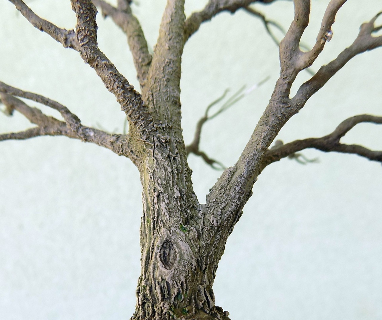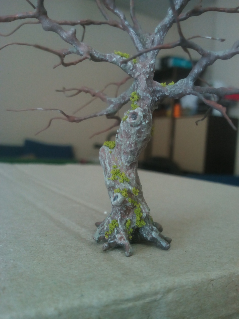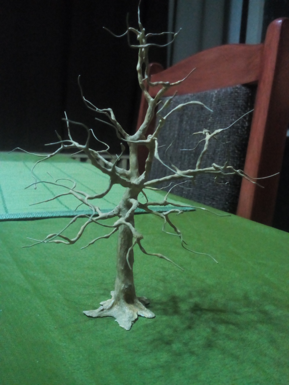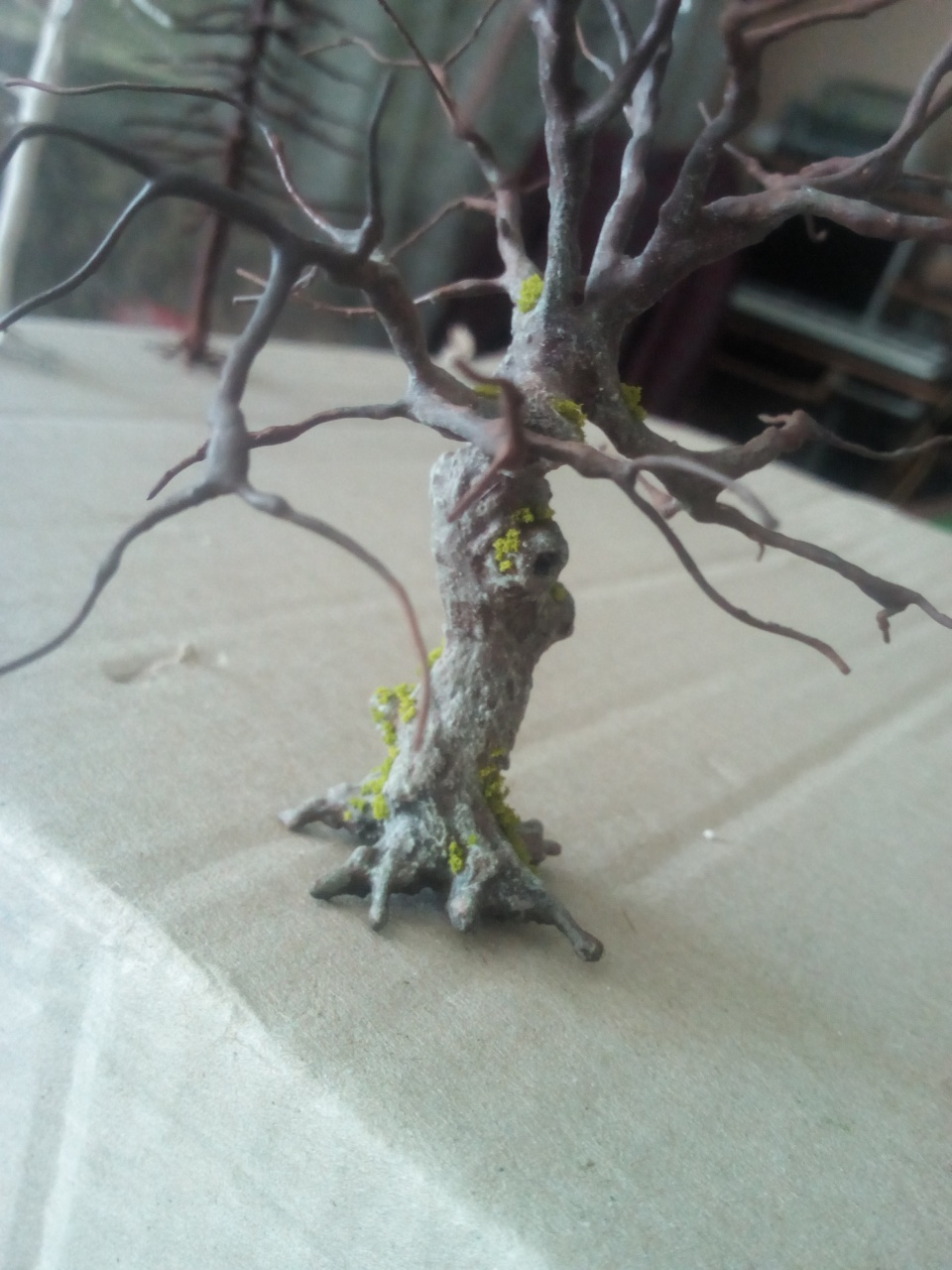 Tényleg nagyon mutatós, így, kopaszon is. Szerintem nem kellene rá lomb, elvégre is "öreg fa", vagyis száraz. Tehát lehet lombtalan. Élethűbbé teszi az asztalt. (Olyan, mint a járművek, épületek "koszolása"...) |