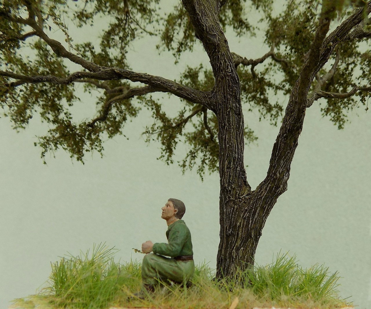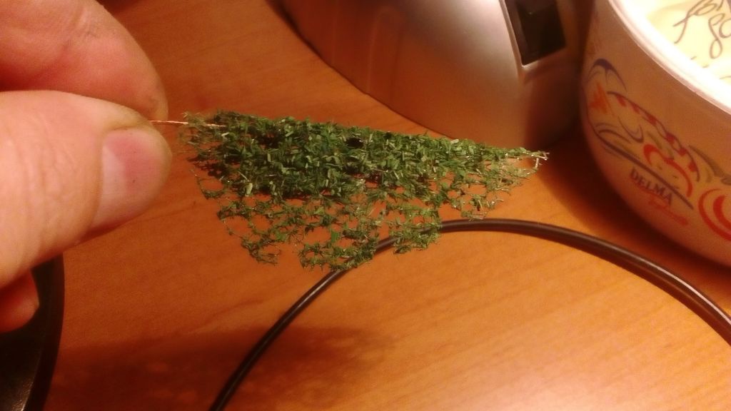 A lomb: Noch 2,5 mm szórható fű. Az ötlet itt kezdődött aztán rájöttem mire hozzám kerül a duplájába fog kerülni. (futár költség) Aztán jött az ötlet a videókból: fűrészpor. Fűrészpor+ sötétzöld akrilfesték+ víz víz/ festék 1:1 arányban. Szárítás: sütőben kis lángon 3 percenként ellenőrizni. utána teaszűrőn szitálni, durva szemcsét kávé darálóban őrölni, újra szita. Akkor lesz jó ha kb 2-3 mm hosszú lesz a szemcse. Csak festett és szárazra kötöt fűrészport daráld más külömben nem lesz jó örleményed. A lombot higitott faragsztóval átfürdetni, majd megszórom a porral (nem fürdetni mert massza lesz belőle csak szórni) A végén Matt akryl lakk sprayval megfújom. Tervezem, hogy feldöcögök valamikor a börzére ott megtekinthető és talán elemek építési fázisaiból is viszek egy sorozatot, hogy látni lehessen a gyártás folyamatát kb 9-10 lépésből lesz kész Véleményem szerint így jobban tanítható, egy úttal láthatja a kedves vásárló, hogy mi az amit megfizet és nem azt mondja ez csak egy 10 perces munka.