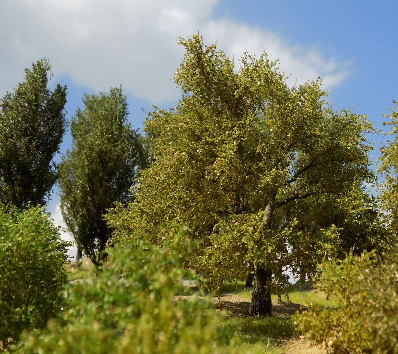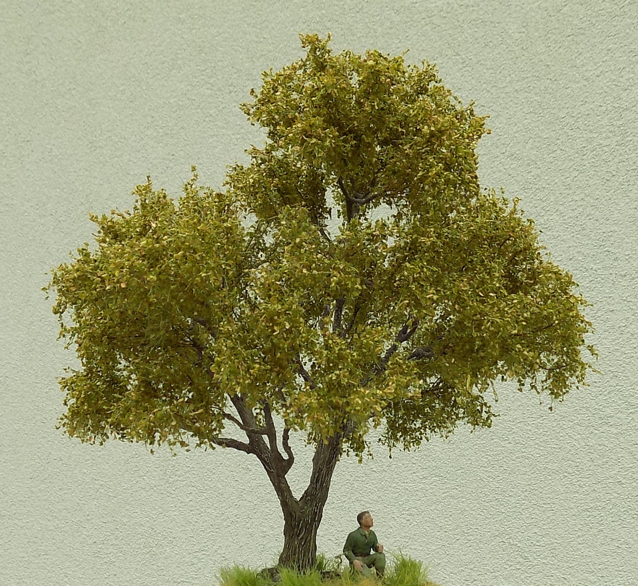 Van még egy egyenesebb szárú testvére, arra tervezek lombot, bár a korábbi szűrőanyag szálait kevésbé lehet kócolni, és gyakran síkban maradnak a szálak. Erre vonatkozóan nem találtam meg még az ideális anyagot, ami mind a levél-szóróanyagok, mind az aprított festett szivacsdarabkákhoz jó lenne. Láttam ugyan olyan videókat, ahol Noch anyagokat használnak ehhez, de ahogy a fórumot néztem, van annál elegánsabb megoldás is. |