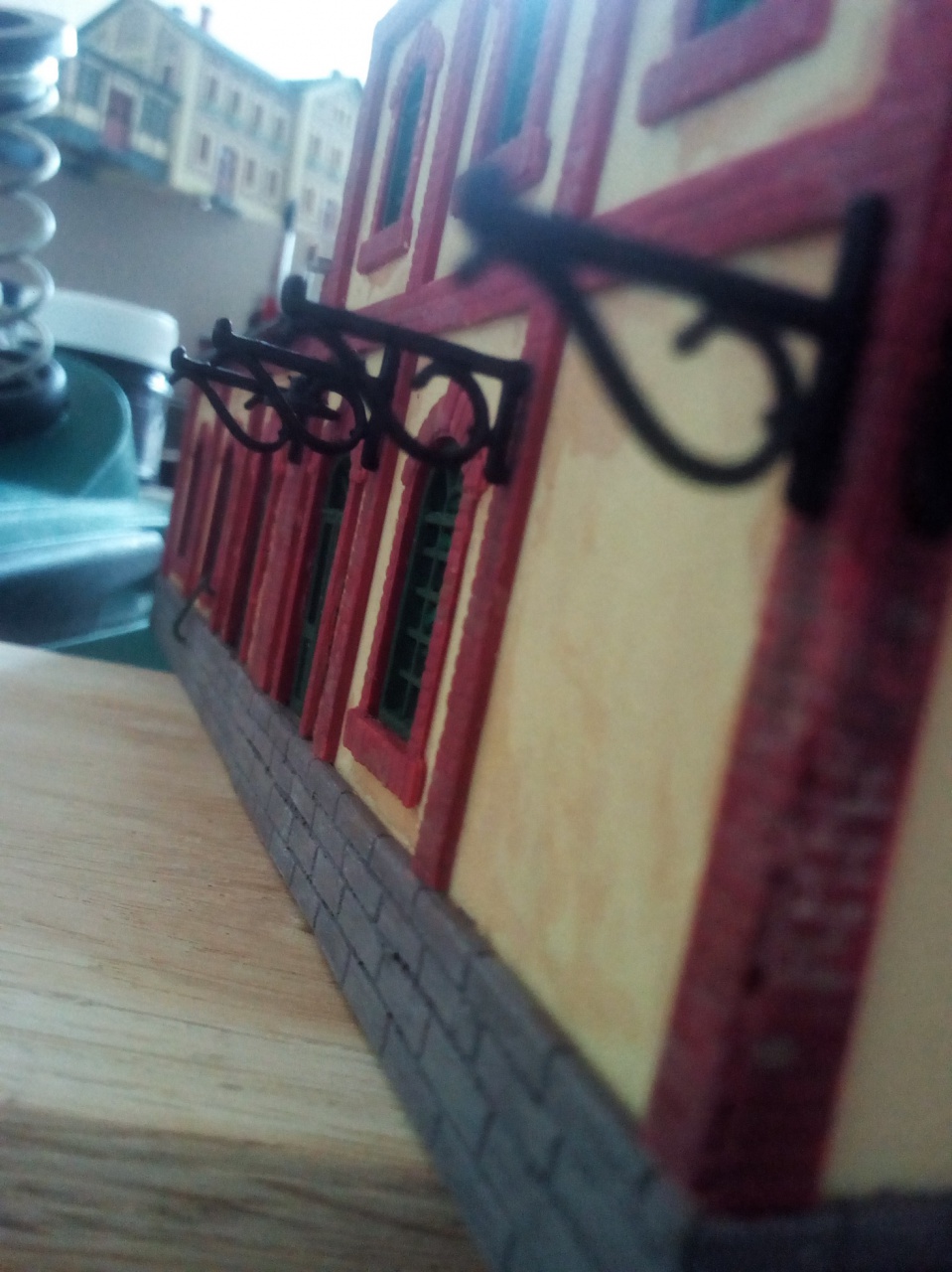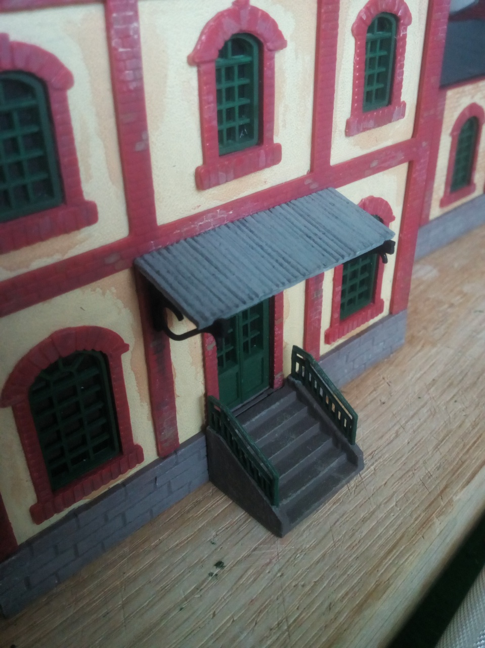 Sziasztok! A korábbi gépgyár épületével haladtam, bár pár alkatrészt ismét helyettesíteni kellett, ilyen a főbejárat feletti két tetőtartó elem is, valamint a rá került tetőlap.