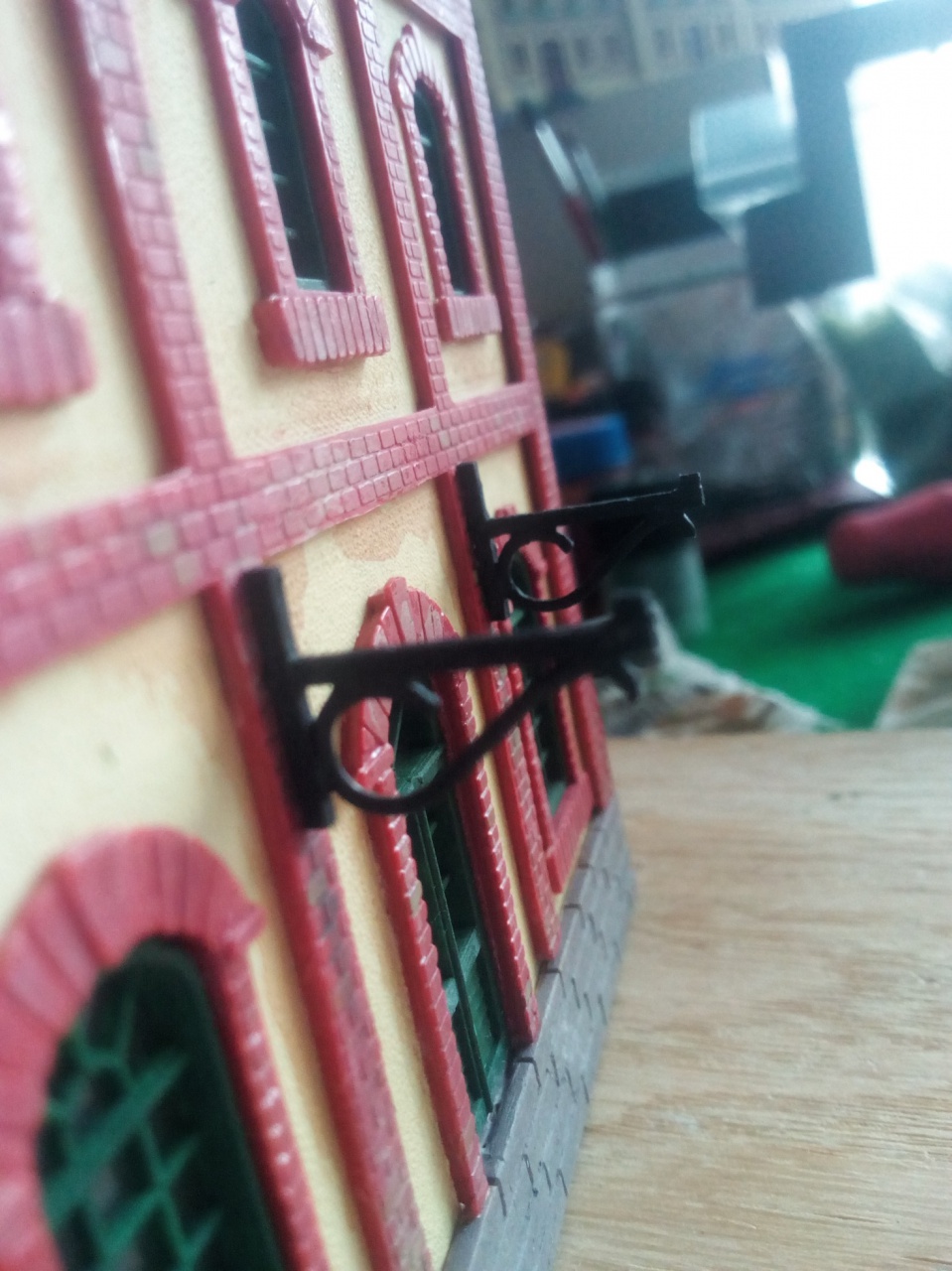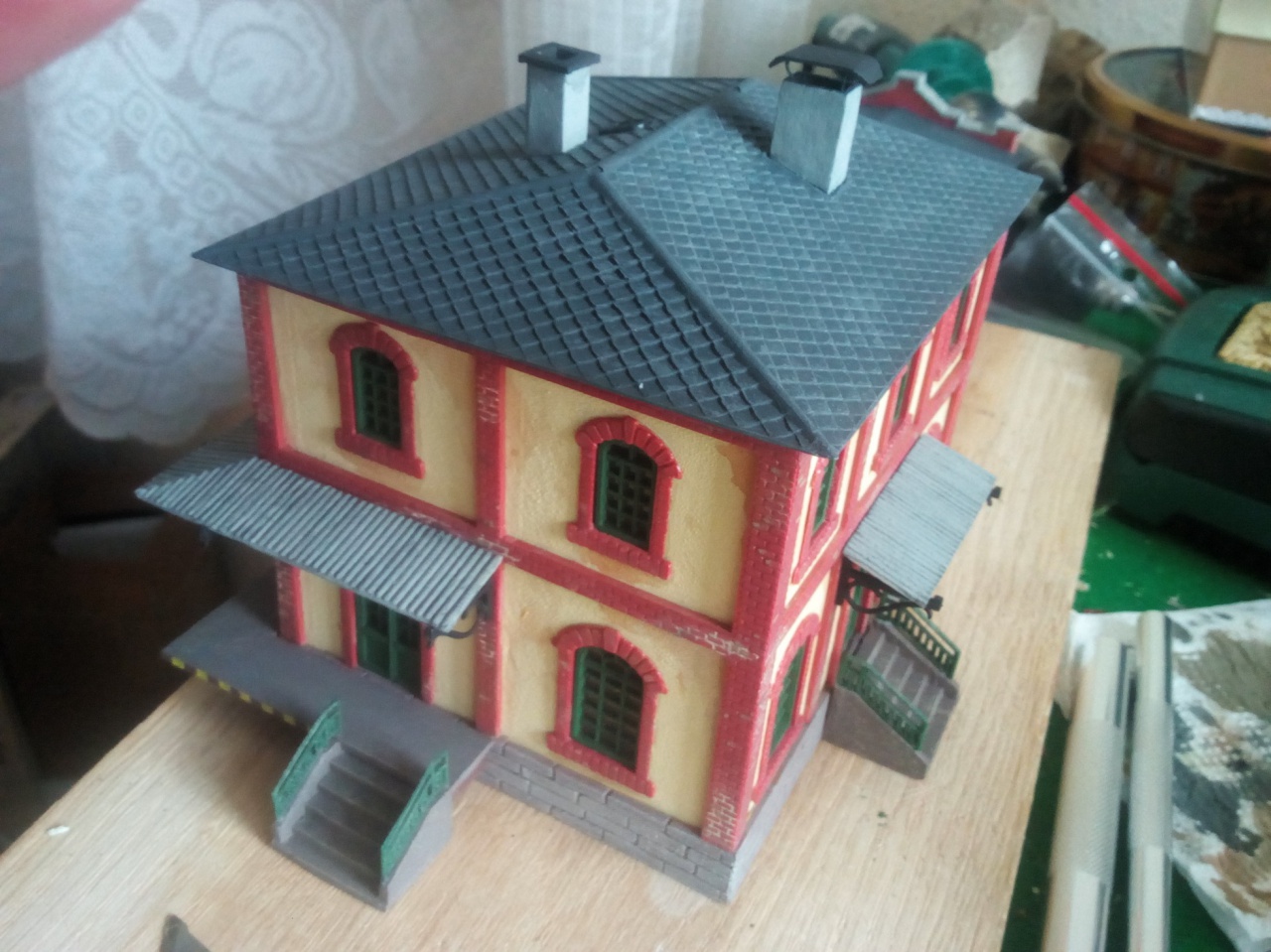 A készülő félben lévő játékasztalra én is beszereztem lepukkanva occón egyet a kalapácsos oldalról. A korlátol töröttel, a kapu fixen ragasztva. Az esővédő tető összevissza felragasztva, ráadásul taknyolva. Ez igaz az egész épület illesztésére is. Nagyjából ez a kiindulás. |