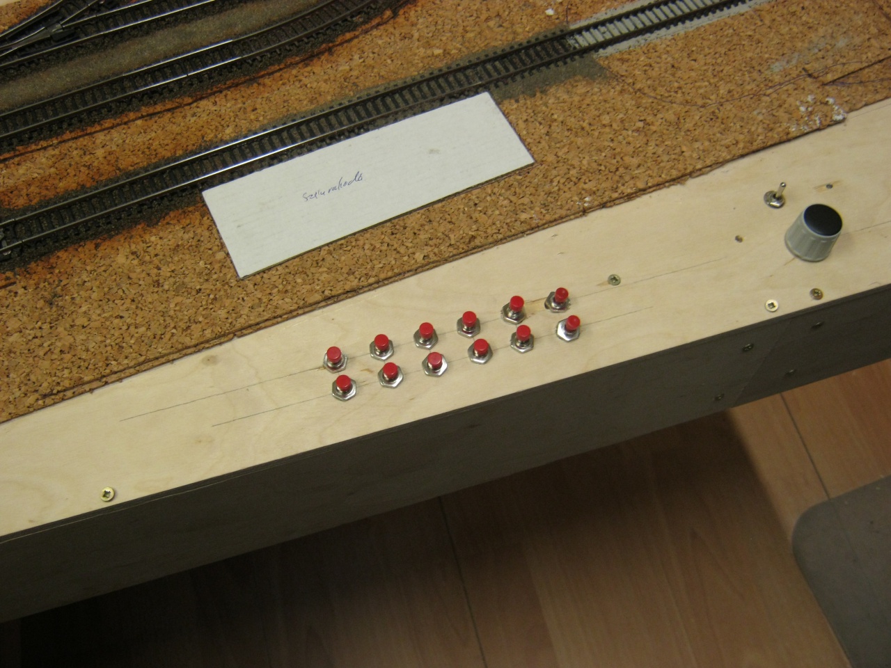 Ez lát el mindent árammal, a váltókat is. A szakaszolt sínek kapcsolóit, és a váltók nyomógombjait is bekötöttem. |