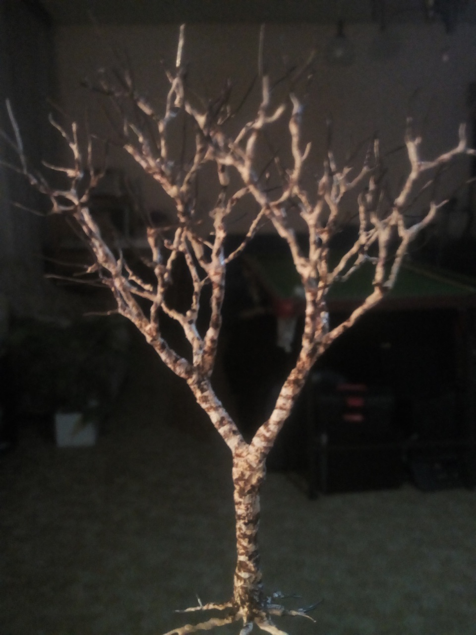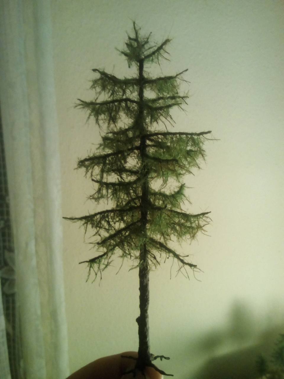 Nemrég kapott némi lombot az újabb módszerrel kreált fenyő, talán egy lépcsővel közelebb kerültem vele a megoldáshoz. A lomb anyaga is saját, és egész jól vizsgázott. A későbbiek során valószínűleg még ezen is lesz némi módosítás. És amíg ezen agyalok hajtogattam egy nyárfa alapot is, mert kell a változatosság. |