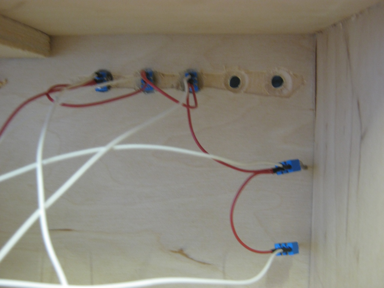 A kék cuccok szerintem a kapcsolók alulról, csak még nem mindegyik került a neki való furatba. Elektronikai boltokban (például Conrad, Lomex) lehet venni. A vezetékek általában forrasztással csatlakoztathatók hozzájuk.