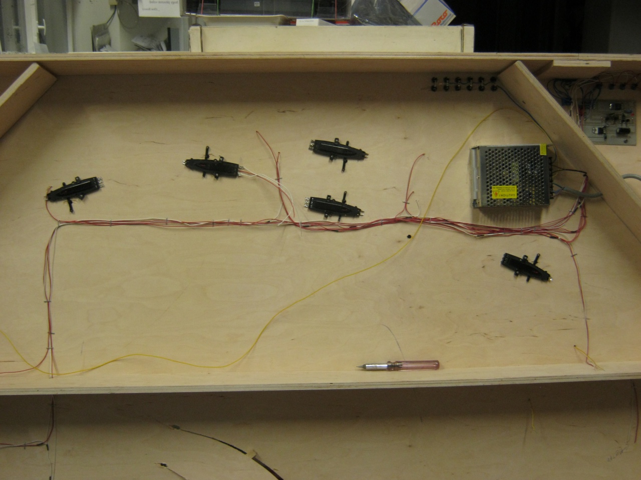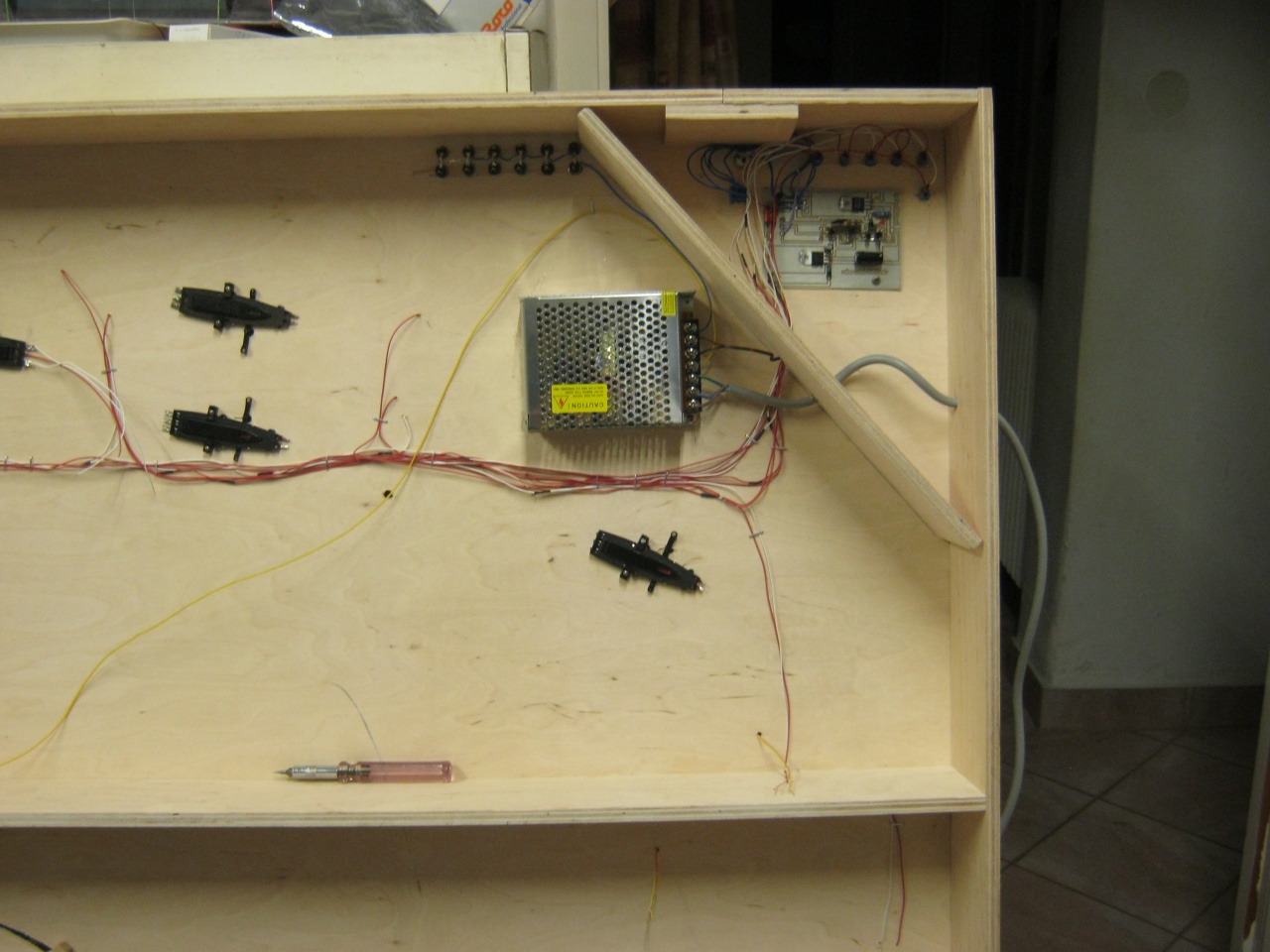 Ez lát el mindent árammal, a váltókat is. A szakaszolt sínek kapcsolóit, és a váltók nyomógombjait is bekötöttem. |