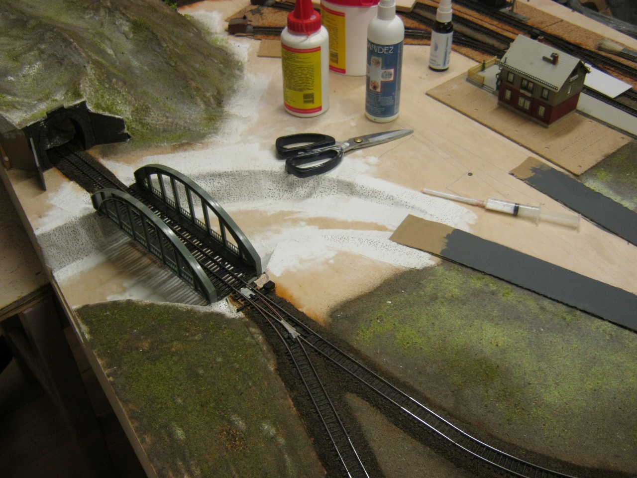 Továbbra is ott tartok, hogy a régi síneket cserélem le az új Tillig TT sínekre. Van egy kanyargós részem, ami helyett sokkal egyszerűbb lenne flexibilis talpfát (Tillig 83025) lerakni és abba beleszuszakolni az egyenes sínszálat (Tillig 83500).