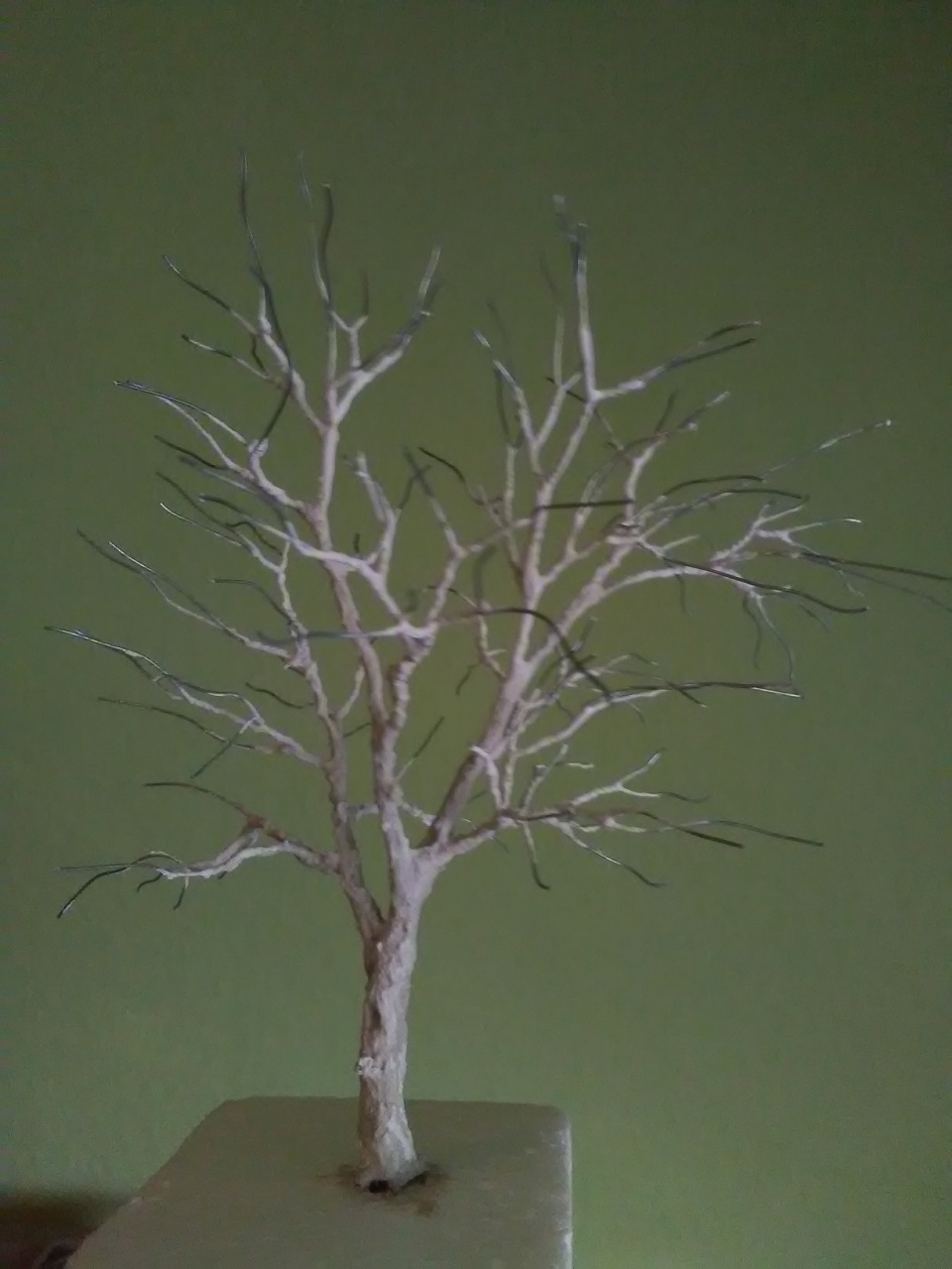 A törzset ecsettel, kézzel festem én is. A lomb alapjához sűrűbb faragasztót használok, a lombanyaghoz viszont higítva, kis sprayflakonba töltve. Utóbbinál arra figyelek, hogy lehetőleg homogén anyag jusson a flakonba, nehogy eltömítse a szórófejet. A végén hajlakk. Valószínűleg nagyobb volumennél áttérek a modellezésben használt termékekre és eszközökre is, egyelőre otthoni környezetben használatos dolgokkal alapozom meg a technikákat. |