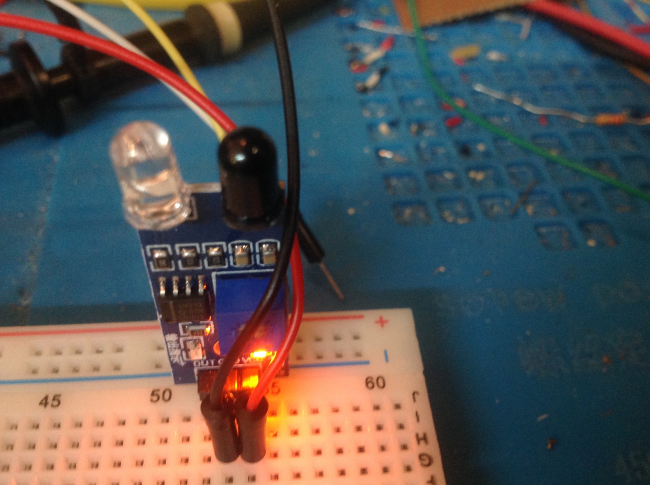 Tulajdonképpen egy IR led-en kívül semmi másra nincs szüksége. A kimenetre egy 400 ohm ellenálláson egy piros led-et tettem, hogy lássam mi történik.