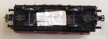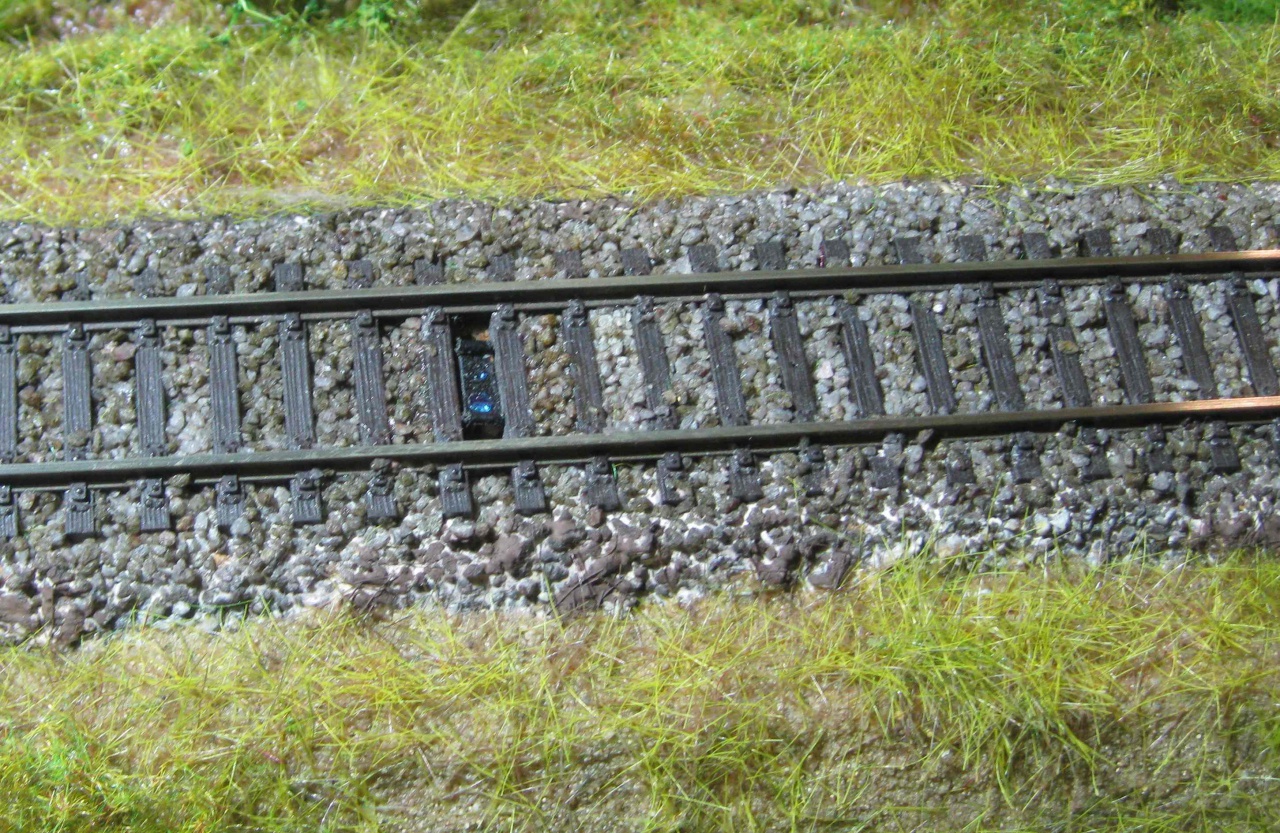 Az újabb gyrtmányú ROCO mozdonyok alján alufóliás cimkén van a gyáriszam, a javasolandó "B" megoldás - párhuzamos elrendezés két talpfa között - még erre a cimkére is reagál.